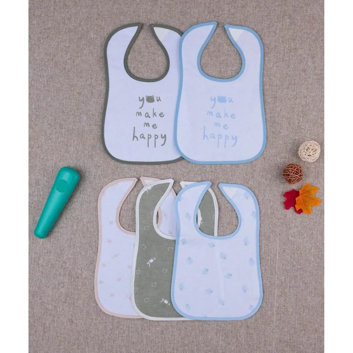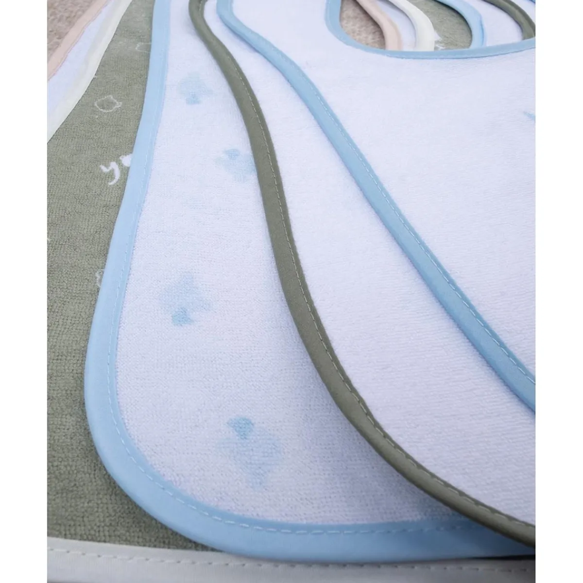 Este práctico pack consta de cinco baberos de rizo con divertidos estampados. La parte posterior está plastificada para evitar que la ropa del bebé se moje, y cuentan con un cierre de velcro que facilita su colocación y ajuste. Ideales para las comidas diarias.
