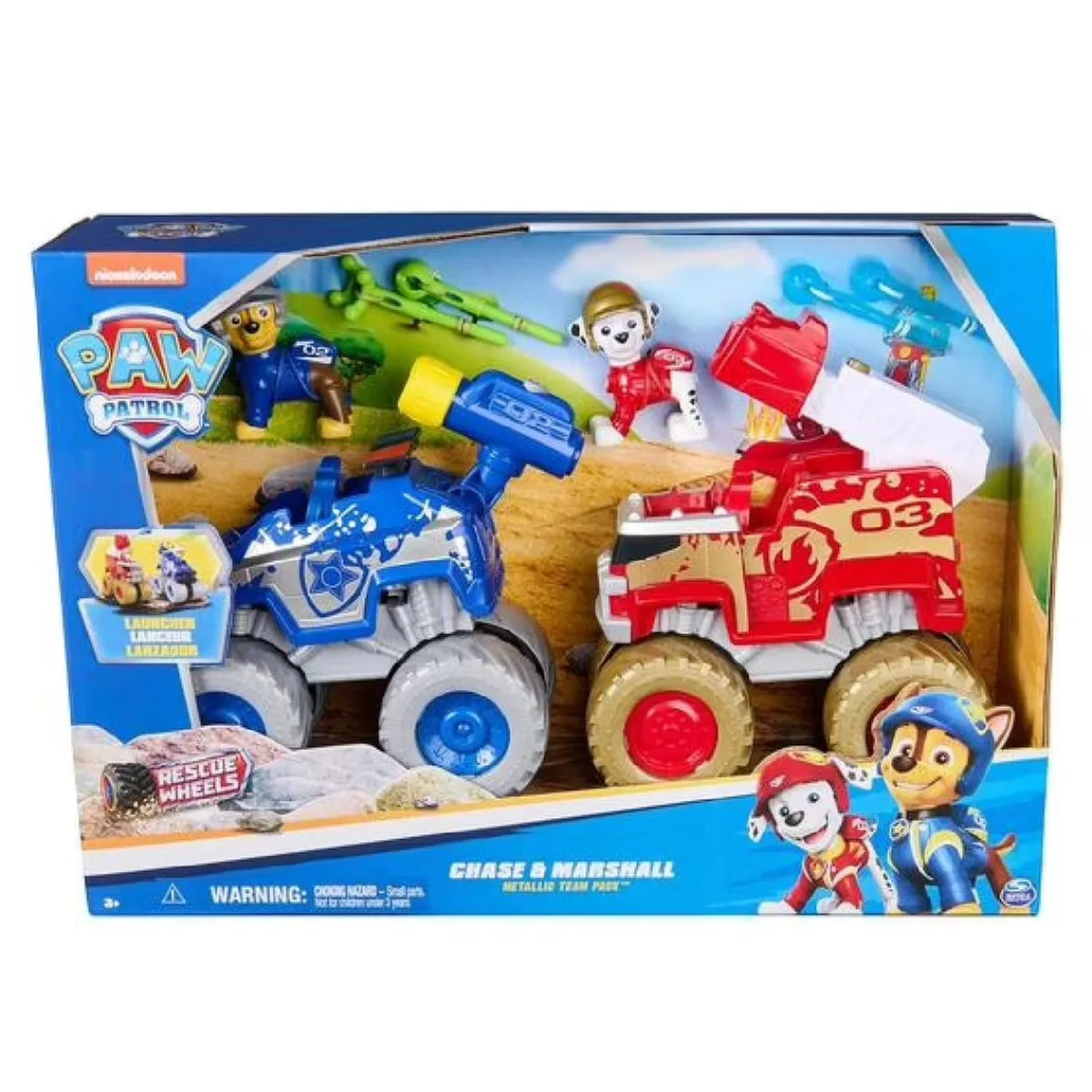 Cada vehículo del pack se presenta con detalles únicos y uniformes metálicos que reflejan la autenticidad de la serie. Los niños pueden colocar a Marcus y Chase en sus asientos y prepararse para el rescate.