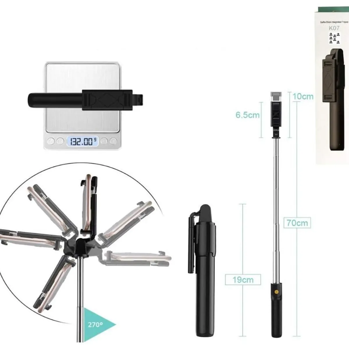 Compacto y Ligero. El diseño de palo de selfie puede estirarse hasta 70 cm cuando está completamente extendido y puede plegarse hasta 19 cm al mismo tiempo. Es fácil de transportar, fácil de guardar en un bolsillo o bolsa, y ocupa poco espacio. El cuerpo principal del palo selfie está hecho de material ABS ligero y duradero, y hay un diseño de esponja en el soporte para proteger el teléfono de arañazos y proporcionar un uso como bolsa de almacenamiento.