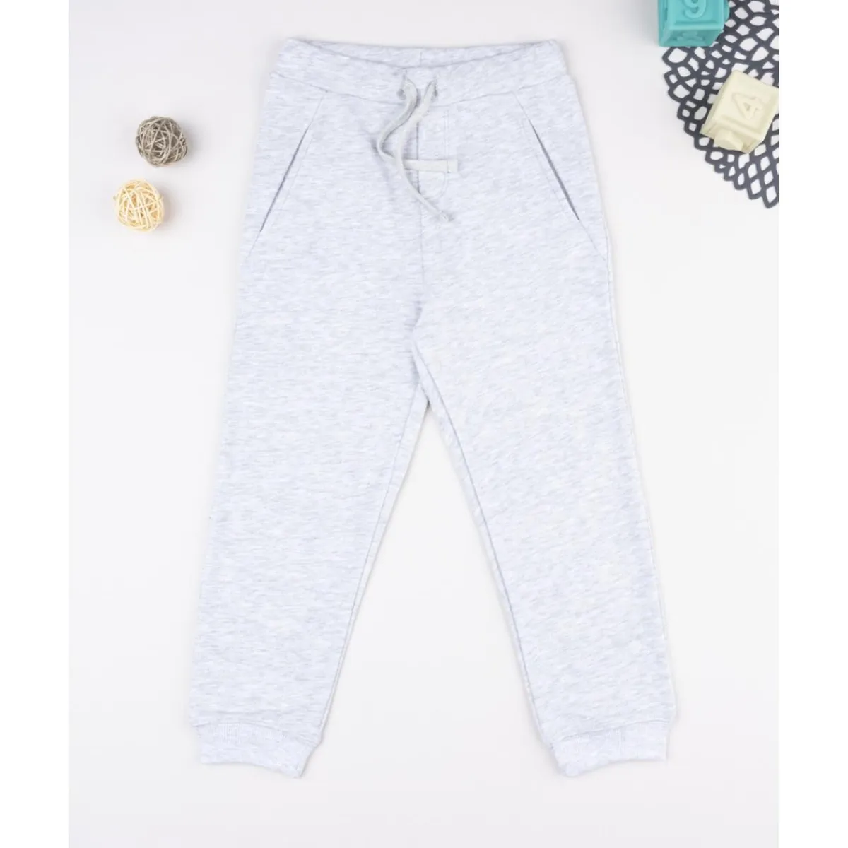 Pantalón en french terry gris claro con bolsillos laterales. Ajuste cómodo y regulable con cordón en la cintura. Estilo versátil y combinable.