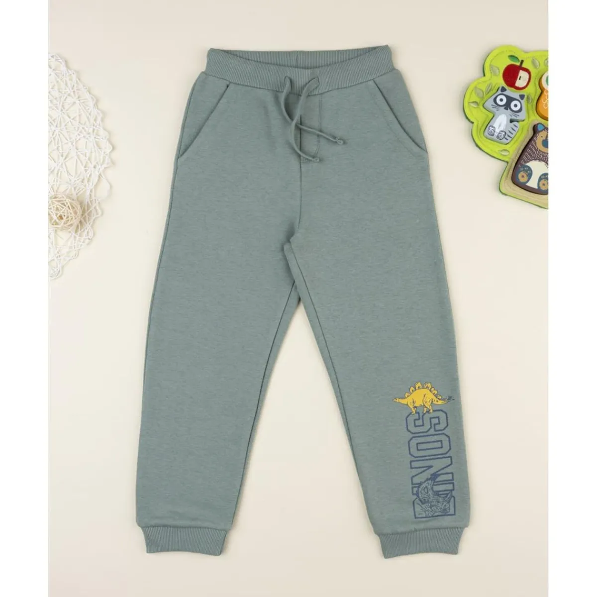 Versátil pantalón felpado para niño en color verde intenso, con pequeño estampado decorativo y bolsillos de corte transversal en la parte delantera. La cintura con cordón ajustable proporciona ajuste cómodo y seguro para los momentos de juego y actividad.