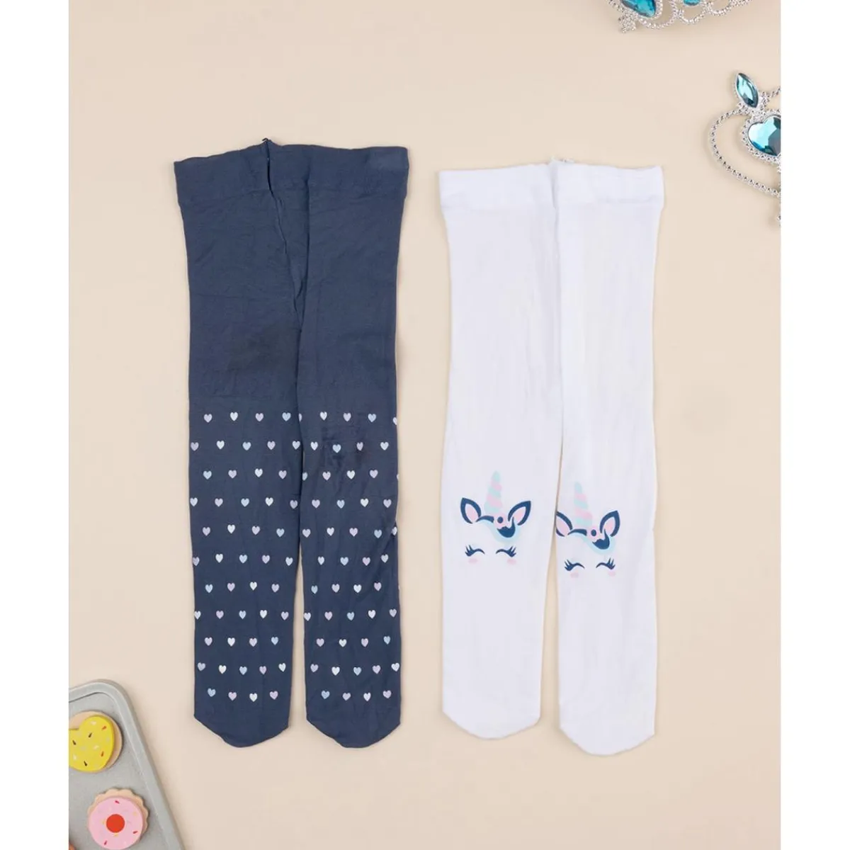 Paquete básico de 2 pantis para niña. Las prendas vienen en azul total y blanco total. Un par está adornado con un estampado de pequeños corazones blancos por todas partes, el otro con unicornios estilizados. El ajuste es suave y práctico gracias a un elástico en la cintura que garantiza cero molestias. Los pantis para niña son adecuados para ocasiones casuales/sofisticadas. Accesorios no a la venta. El paquete contiene solo la prenda de vestir.