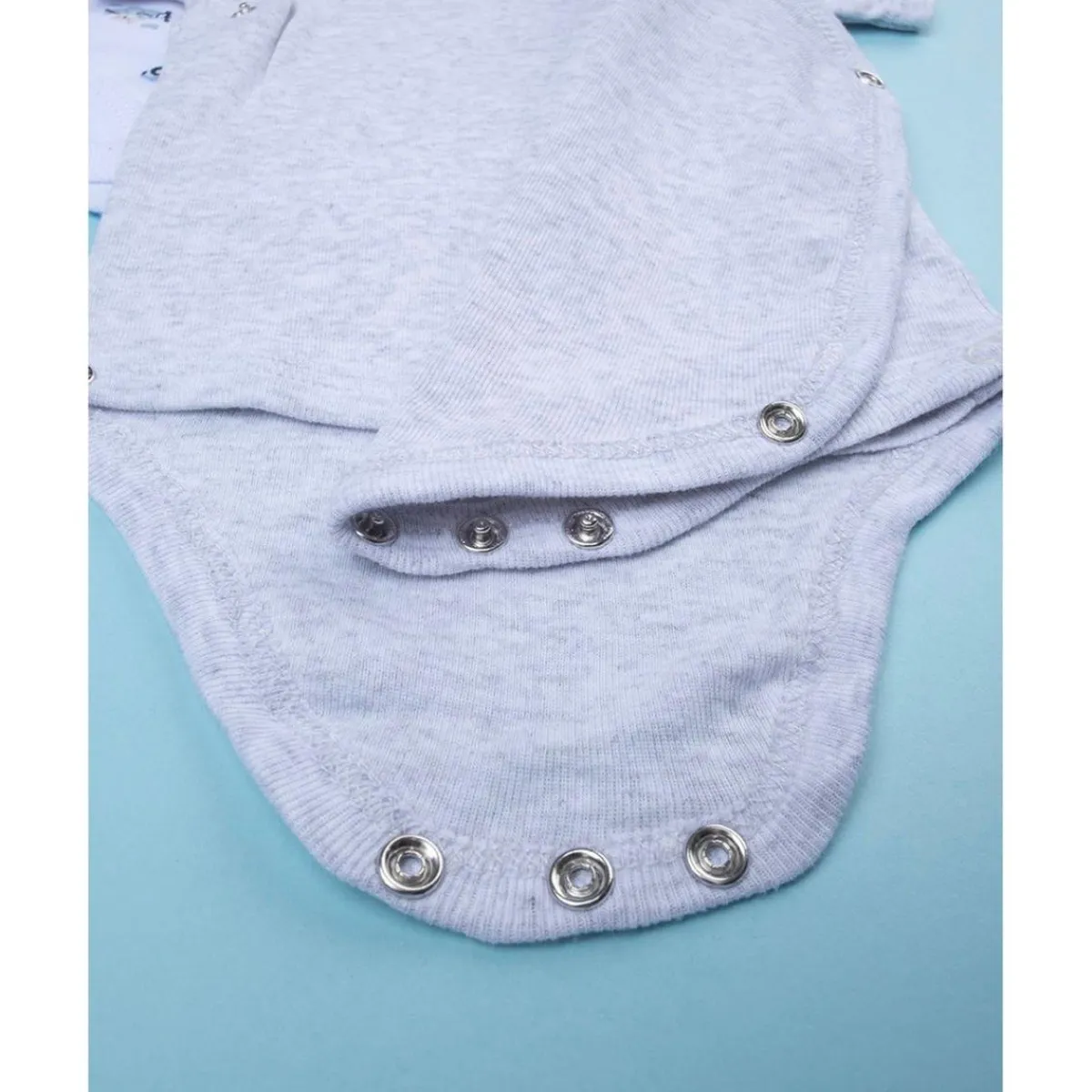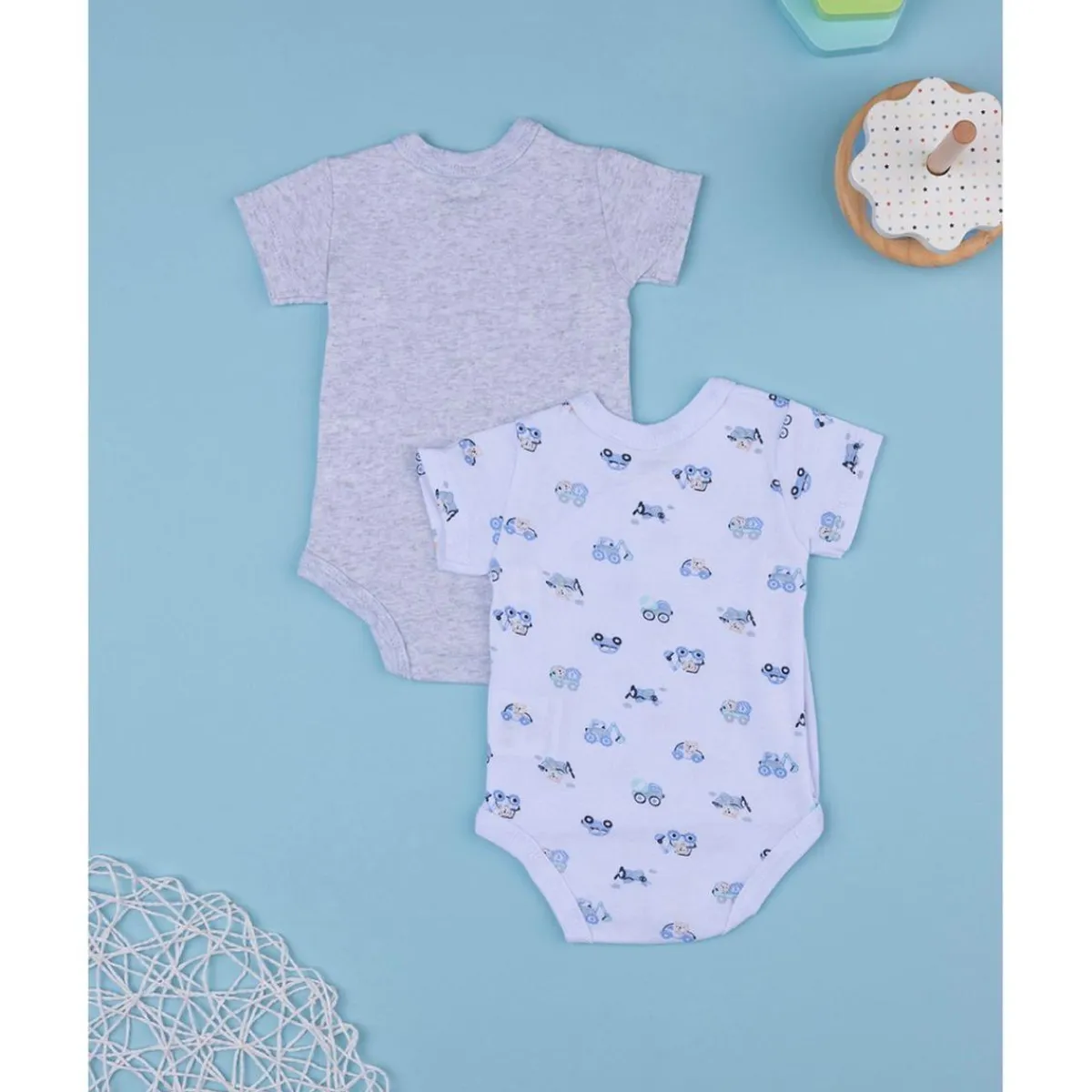 Lindo paquete compuesto por dos bodis, uno en algodón gris claro mélange con cierre de botones automáticos en el lateral y la entrepierna. El frente está decorado con la impresión de un simpático osito; el otro es de algodón blanco con estampado allover de cochecitos y avioncitos.