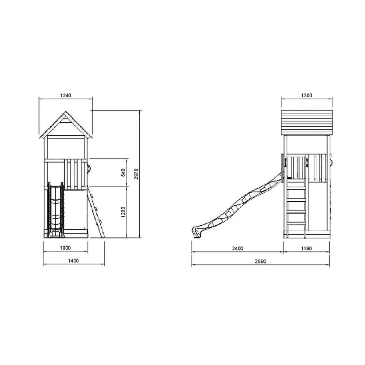 Parque juegos infantil de madera Tibidabo con casita. El Parque infantil Tibidabo con casita, es una torre de madera cuadrada fuerte y muy bonita para su jardín. Su estructura alberga una casita en toda la mitad inferior. La casita, cuyo techo es a la vez el piso de 120 cm de altura por el que bajar por el tobogán, es ideal para que los más pequeños se refugien, jueguen y sueñen con mil aventuras. También podrán guardar en ella sus juguetes. La casita cuenta con una puerta de media altura que, junto con la ventana que hay en uno de los laterales, permite la entrada de mucha luz para que los niños puedan jugar durante horas. Las maderas de la casita dan, a su vez, mucha resistencia y estabilidad al conjunto del parque.