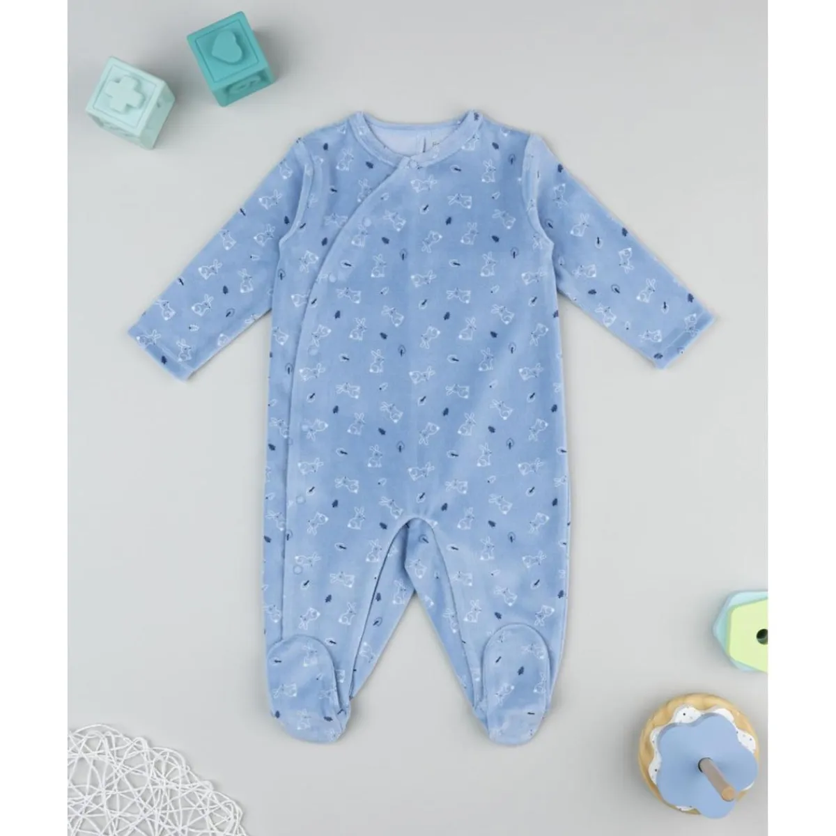 Este pelele en terciopelo azul claro para niño está decorado con un delicado estampado de conejitos. Con diseño de una sola pieza y pies incorporados, asegura comodidad y abrigo durante todo el día.