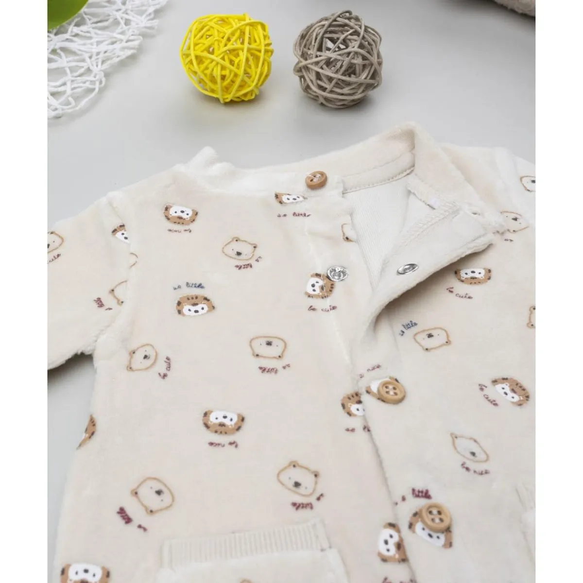 El pelele de terciopelo beige para recién nacido es una prenda suave y confortable. Presenta estampado allover de pequeños animales, con bolsillos aplicados en la parte frontal que aportan encanto al diseño.
