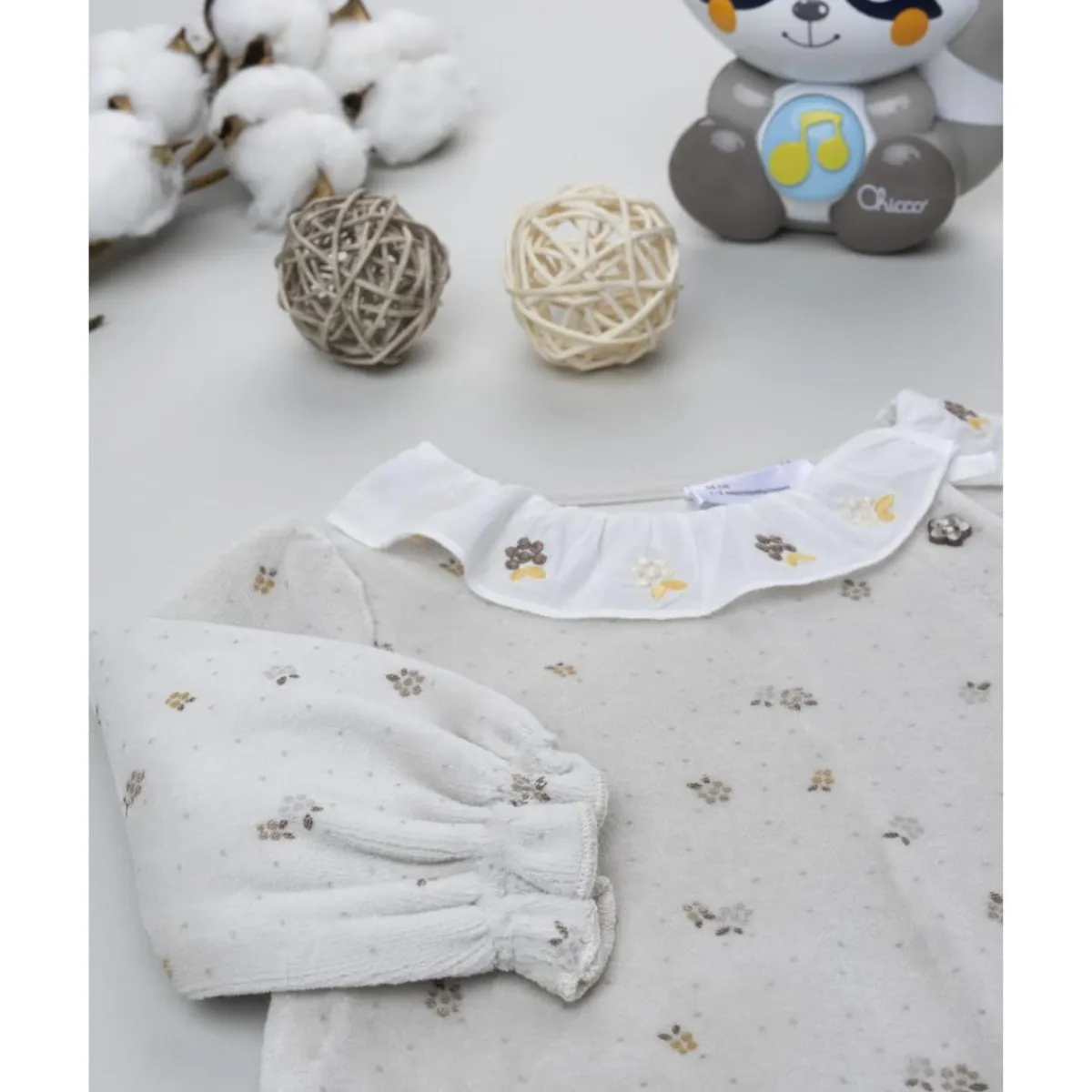 Este pijama de bebé de manga larga está confeccionado en felpa aterciopelada, ideal para mantener a la recién nacida abrigada y cómoda en sus primeros meses. Su diseño en marrón claro con bordados allover y cuello blanco bordado aporta un aire elegante y delicado. Incorpora pies cerrados y puños fruncidos para mayor ajuste y suavidad.