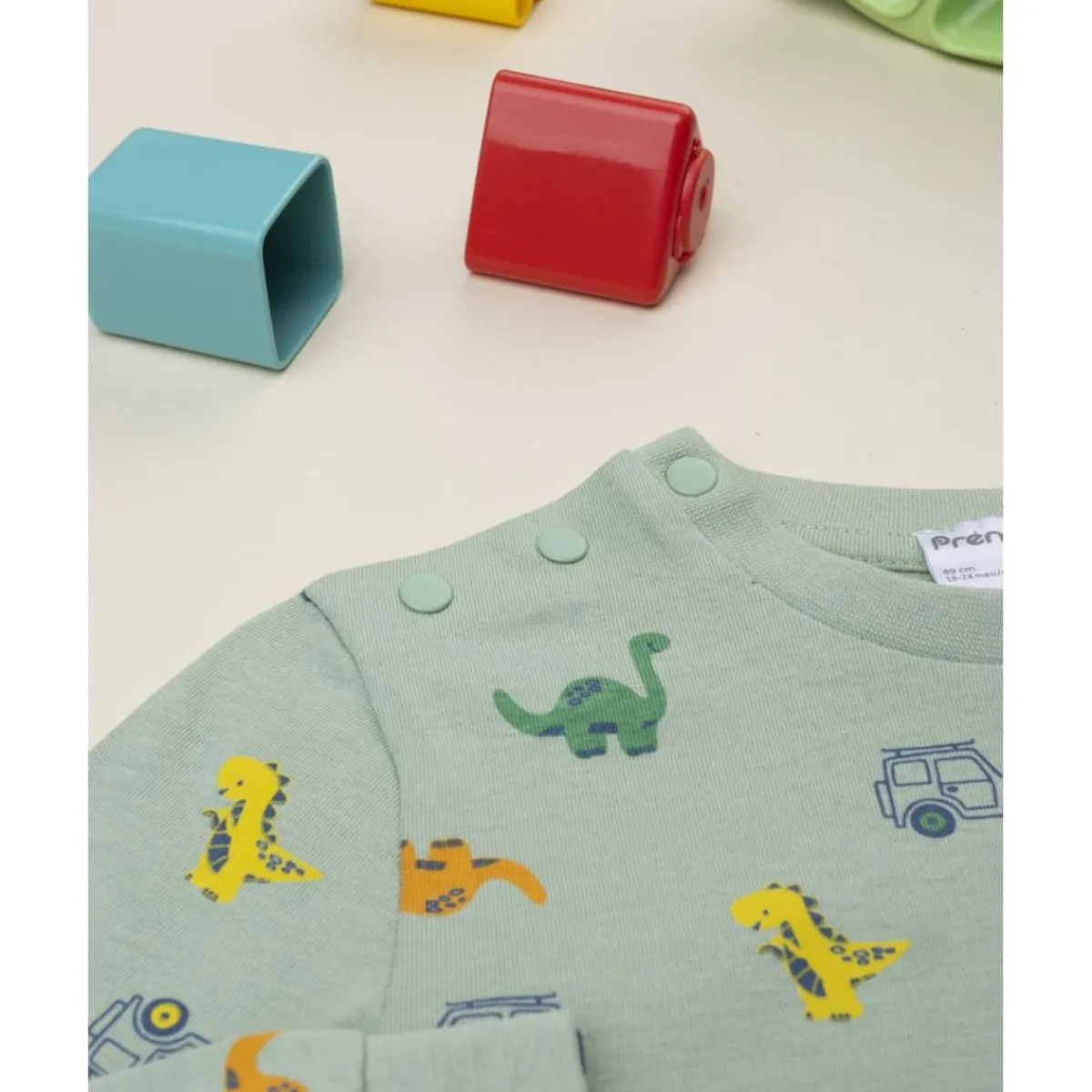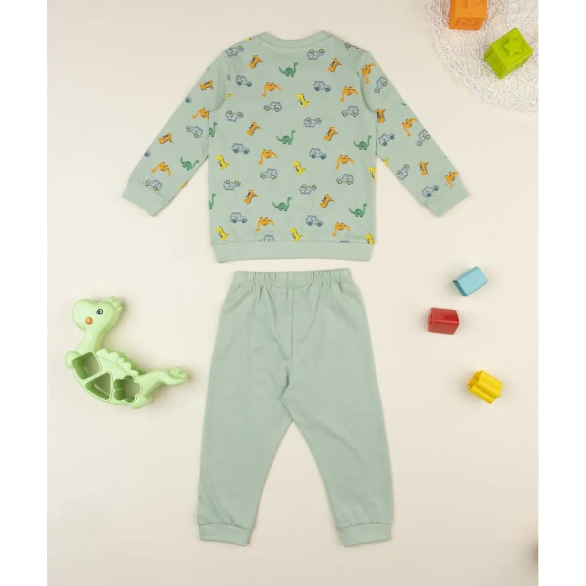 Este pijama de dos piezas para niño está compuesto por una camiseta de manga larga verde con un estampado de dinosaurios y unos pantalones a juego. Los pantalones tienen una cintura elástica con cordón ajustable, lo que permite un ajuste perfecto y cómodo. La camiseta tiene botones automáticos en el cuello para facilitar el uso.