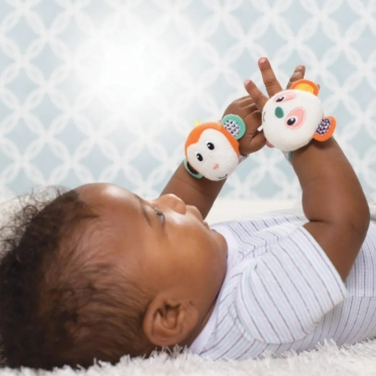 Se fijan fácilmente con velcro a las muñecas o a los tobillos del bebé y aprovechan sus movimientos naturales para estimular sus sentidos.