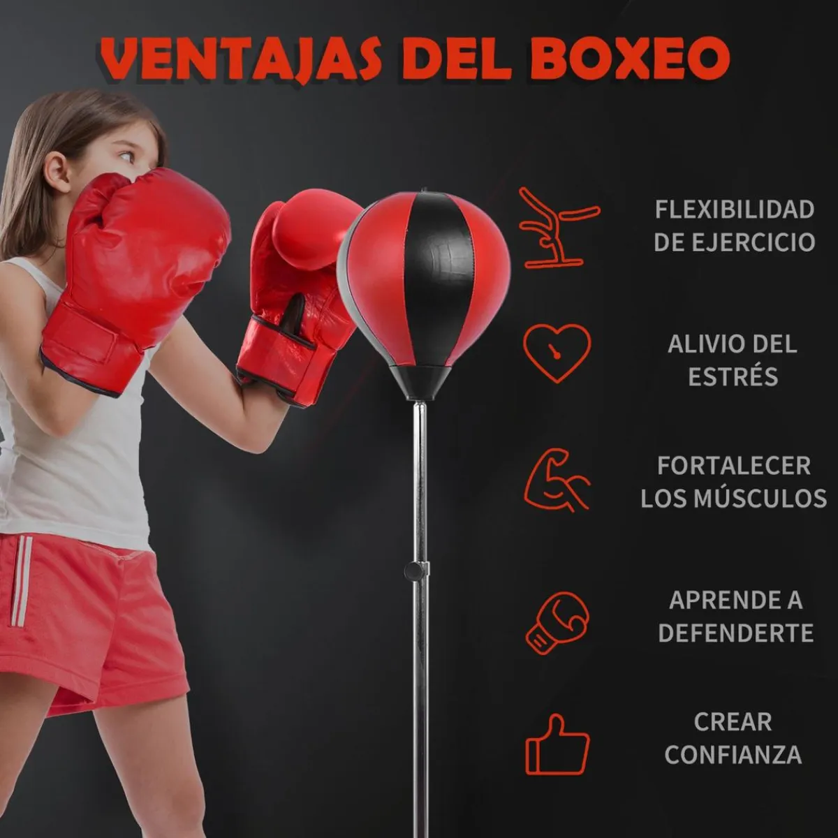 - Incluye un saco de boxeo portátil con soporte, un par de guantes y un inflador.