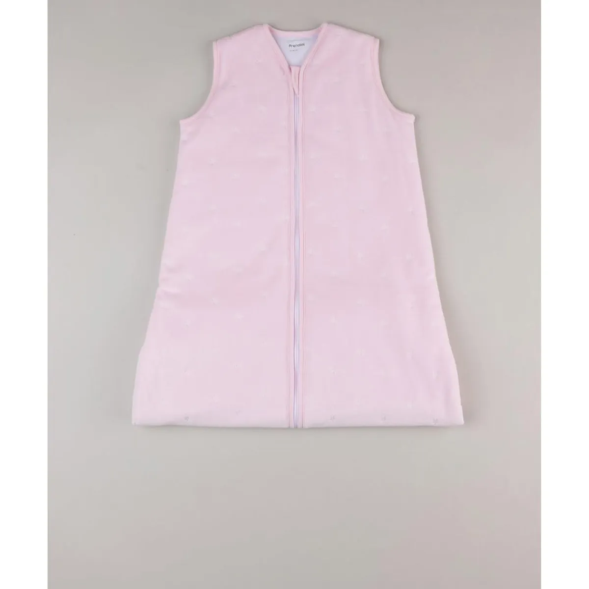 Este saco de dormir para bebé niña es la opción perfecta para garantizar un descanso seguro y cálido durante la noche. Confeccionado en suave terciopelo de ciniglia con interior en algodón 100%, ofrece una textura delicada sobre la piel sensible del bebé. Su diseño presenta un dulce color rosa claro decorado con un estampado all-over de estrellitas en tono coordinado y un interior en color beige suave que aporta contraste.