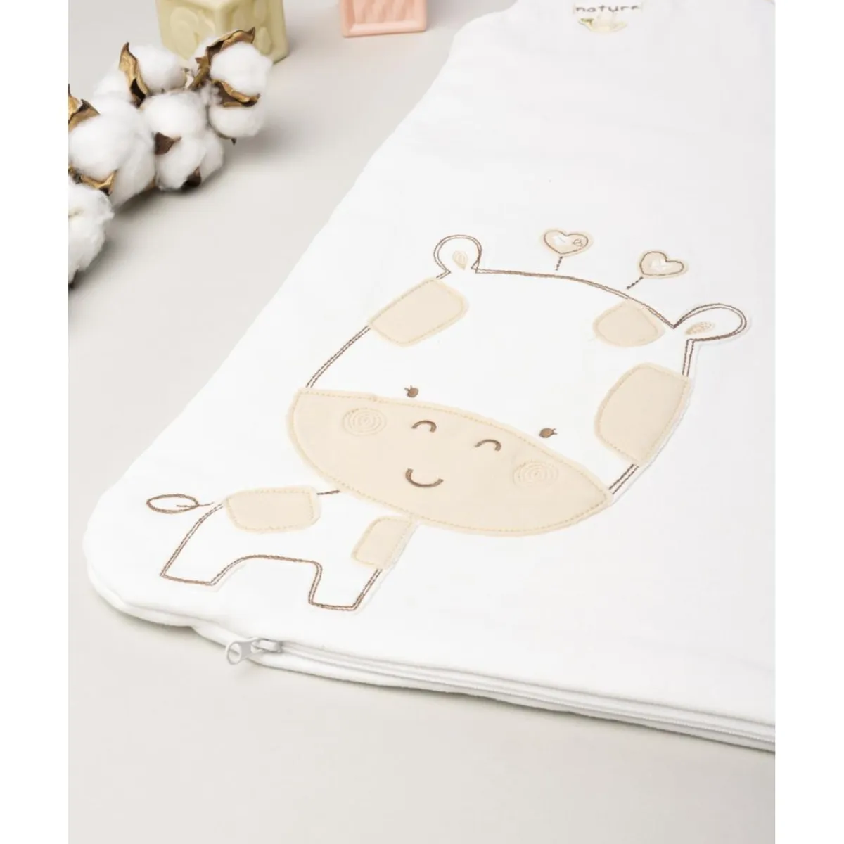 Dulce saco de dormir para niña. Prenda en color crema total con estampado de animalito coordinado. Uso práctico y manejable gracias a cremallera frontal en línea transversal. Fabricado en algodón oeko-tex, probado para sustancias nocivas que asegura alta seguridad. Accesorios no incluidos. El paquete contiene solo la prenda de vestir.