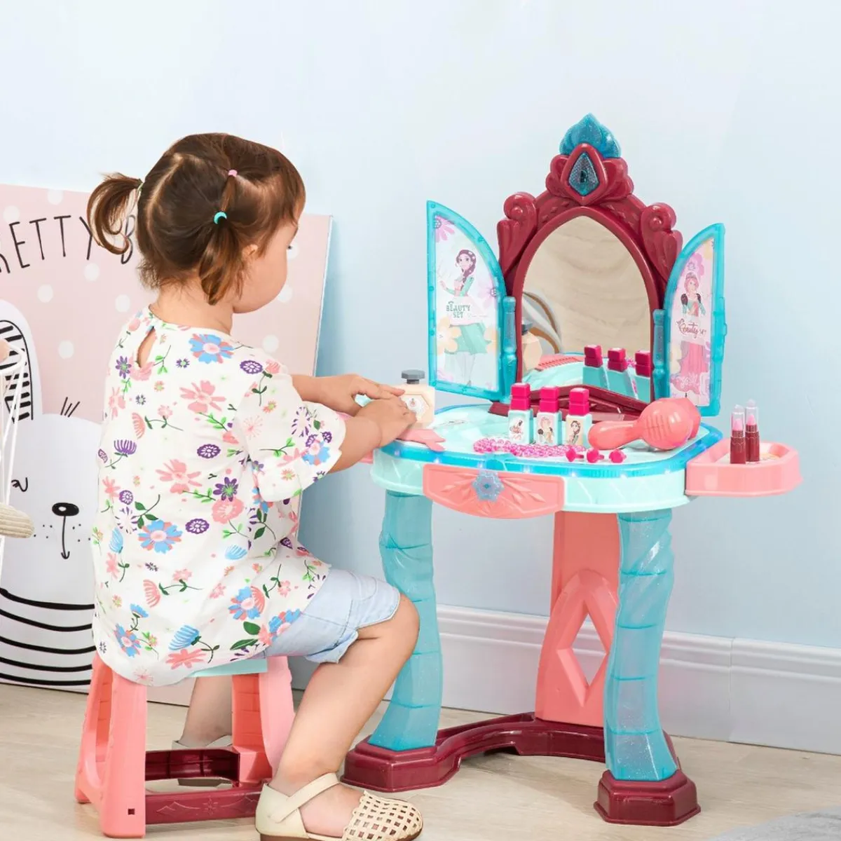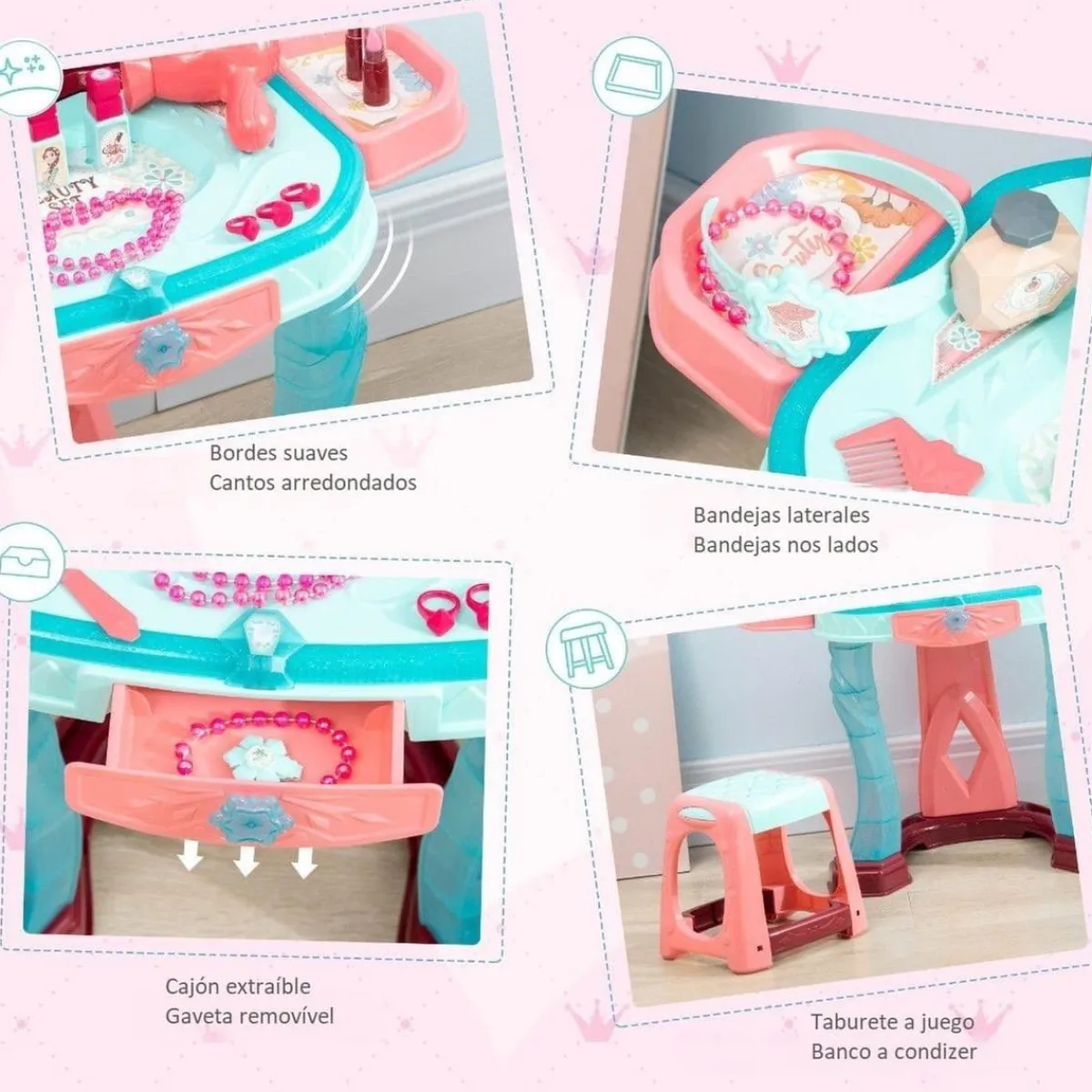 Con un diseño estilo princesa, viene con el taburete a juego y cuenta con un espejo mágico y muchos accesorios incluidos, entre ellos, pintalabios, esmalte de uñas y peine.