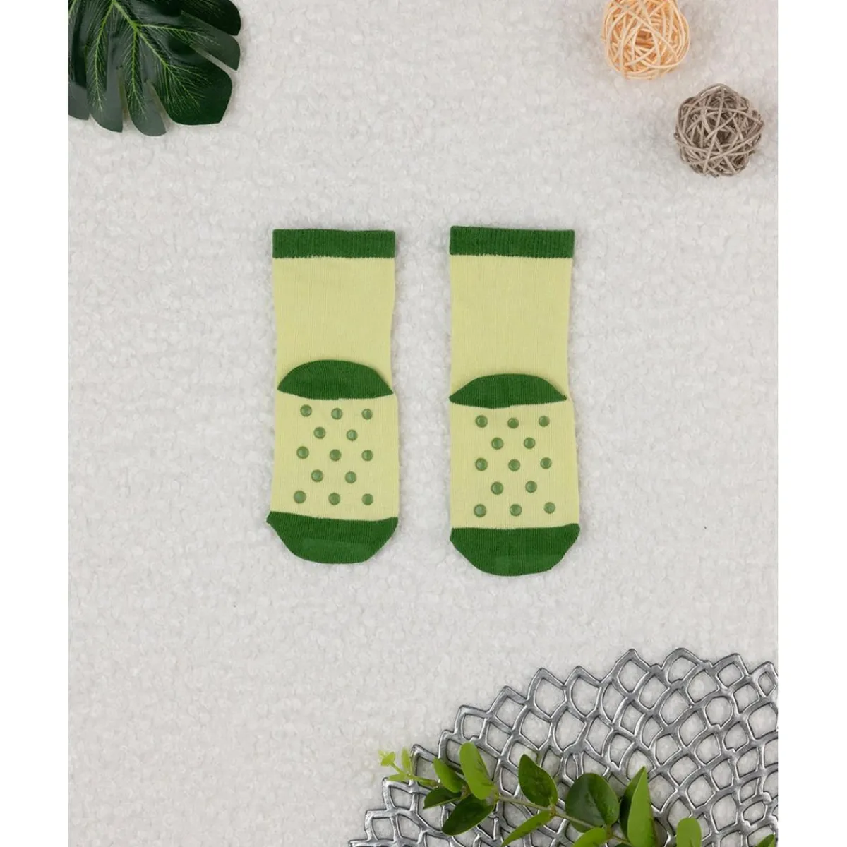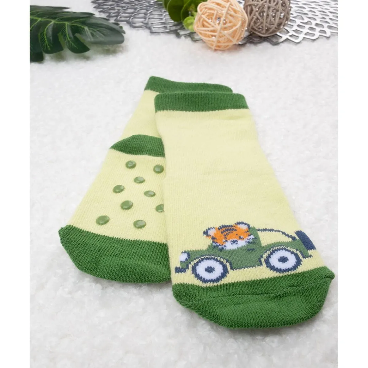 Calcetines antideslizantes de colores para niños. La prenda se desarrolla en varios tonos de verde con estampado de tigre a juego. El ajuste es suave y garantiza cero molestias con gomitas que permiten estabilidad. Accesorios no a la venta. El paquete contiene solo la prenda de vestir