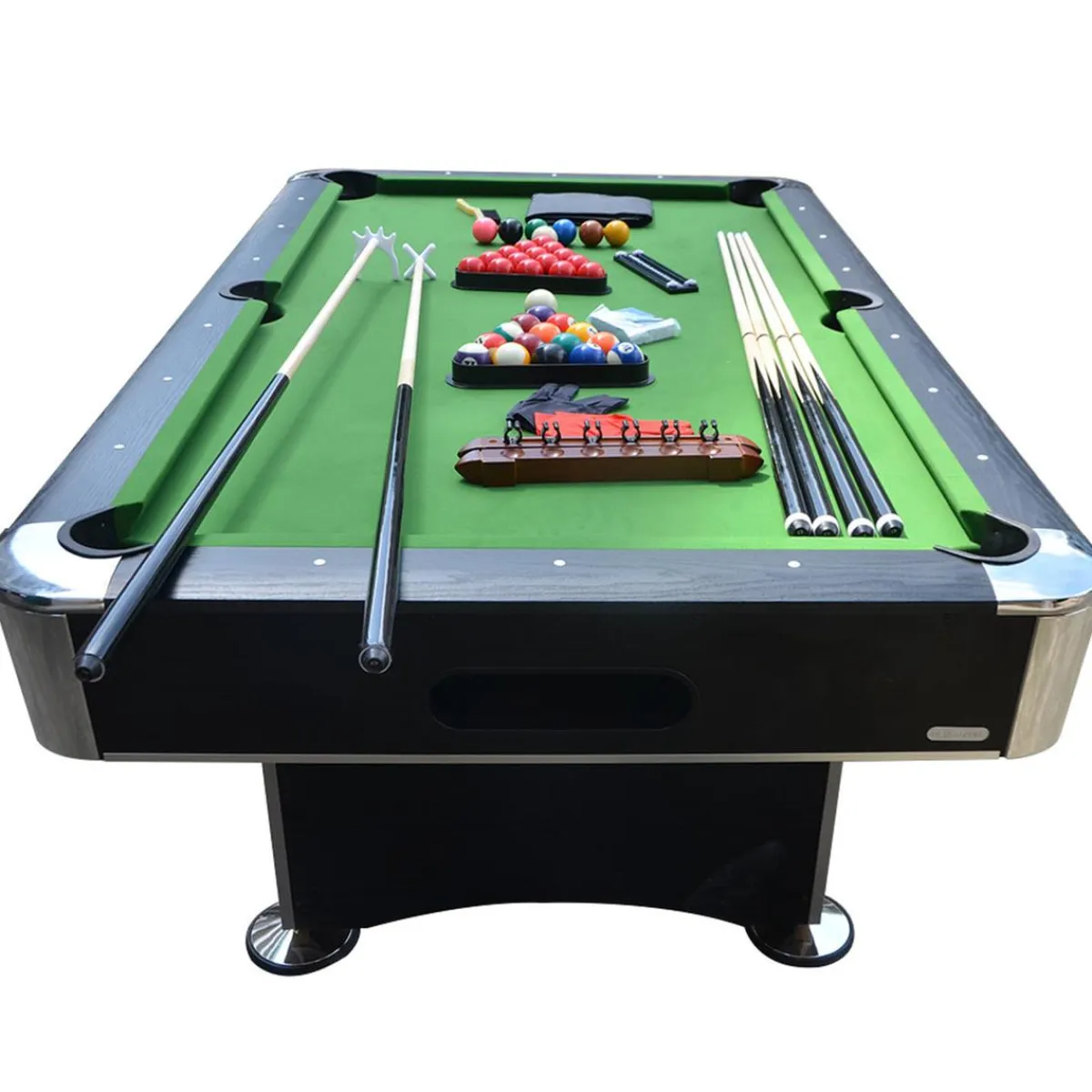 - Accesorios incluidos: bola de billar, triángulo para snooker, triángulo, 4 tacos 57”, 2 sticks, 6 orificios raqueta, tapa de color verde, 2 guantes negros, 2 guantes rojos, una caja de tizas con 20 piezas, 1 cepillo, 1 marcador, 1 funda.