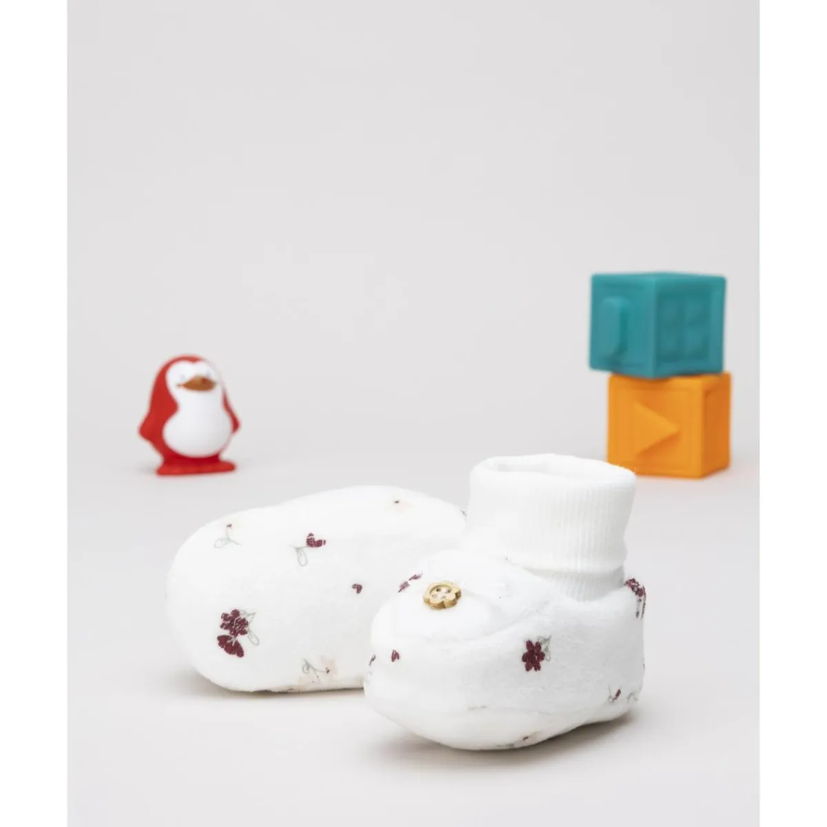 Tiernas botitas de bebé para niña en blanco con pequeños dibujos coordinados. Cuentan con un suave puño en el tobillo que asegura comodidad y ajuste práctico para los primeros pasos.