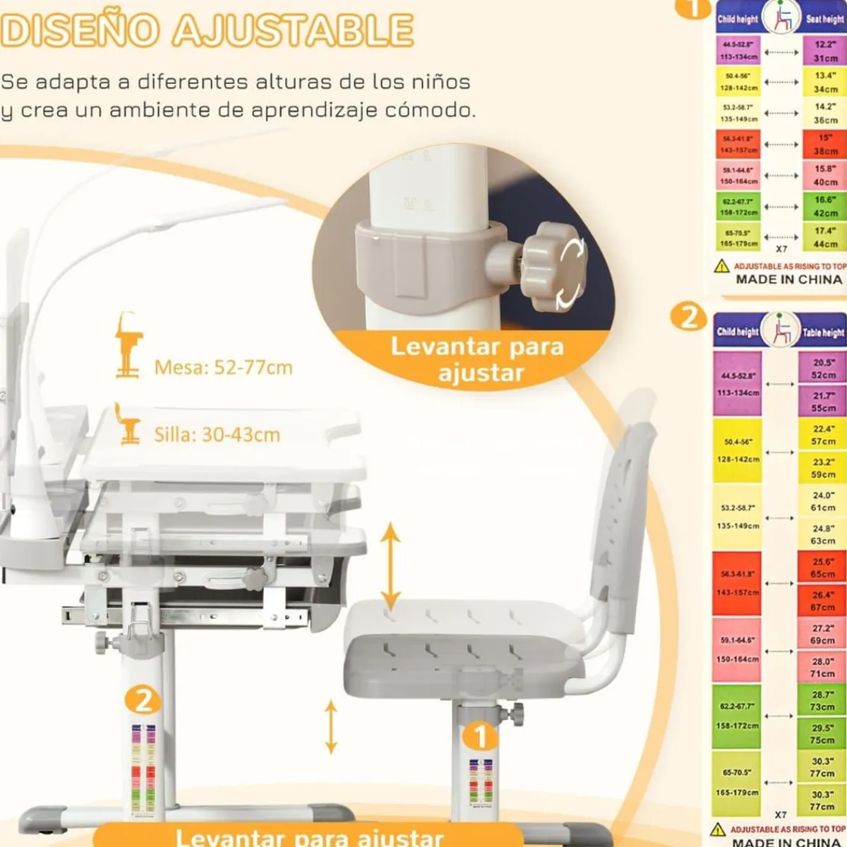 - La altura de la silla y de la mesa son ajustables.