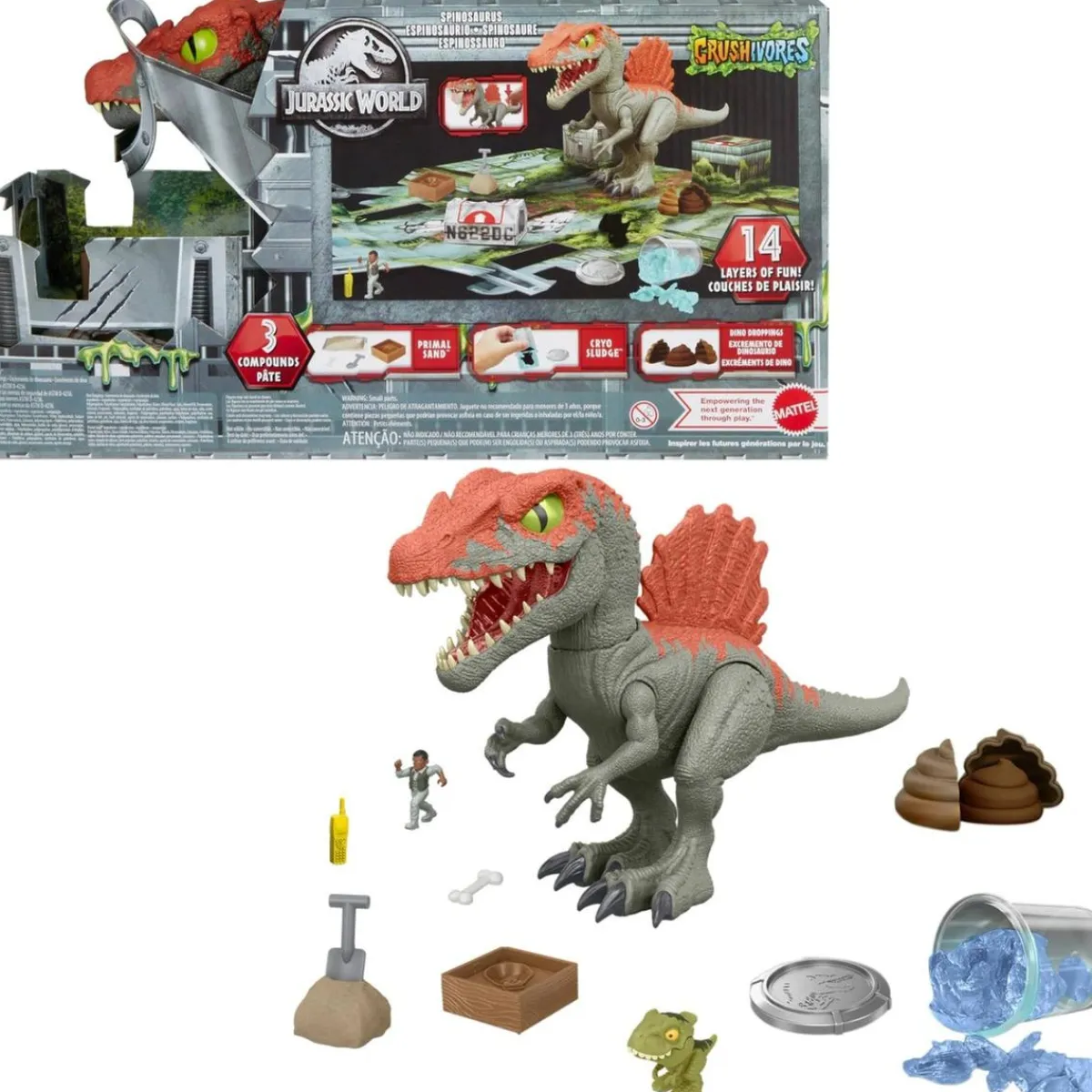 Dentro del paquete, se esconden sorprendentes elementos que invitan al descubrimiento. Los niños pueden encontrar una cápsula de Cryo Sludge que oculta un minidinosaurio, y una arena Primal Sand que permite excavar y moldear, amplificando la experiencia sensorial. Incluso la masa de caca de dinosaurio promete momentos de risa y creatividad.