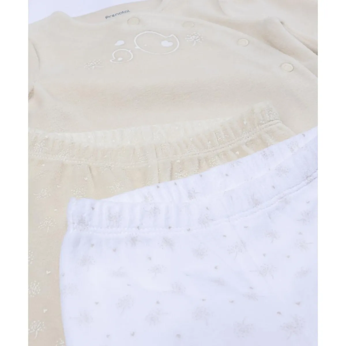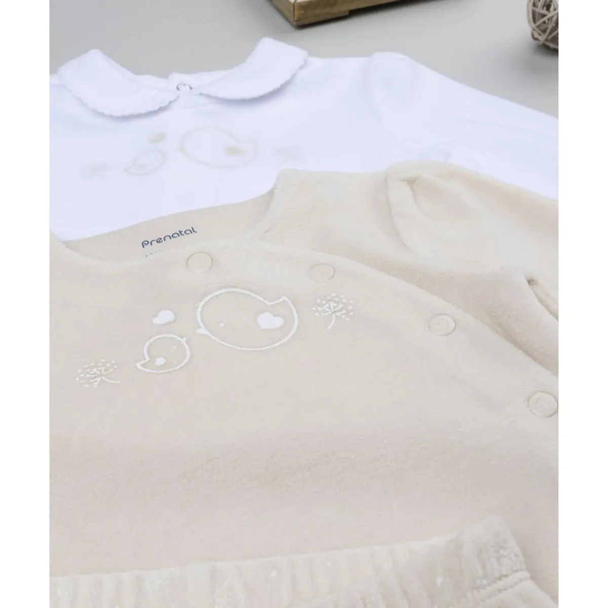 Este pack de conjuntos incluye dos combinaciones cálidas y suaves en tonos neutros, ideales para los primeros meses de la niña. Cada set está compuesto por camiseta de manga larga con botones automáticos y pantalón con pies integrados, uno en blanco y otro en beige, ambos con diseño delicado y fácil de combinar.