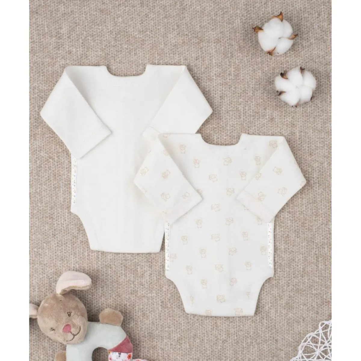 Este dulce pack de 2 bodies para niña está confeccionado en 100% algodón Oeko-Tex, garantizando máxima seguridad y suavidad. El primer body tiene un fondo color crema con una estampación de ositos en tonos marrones pastel. El segundo body presenta un osito estilizado a la altura del corazón, en un suave marrón pastel. Ambos bodies tienen mangas largas, bordados en las costuras y botones automáticos en la entrepierna y al frente, sin resaltar.