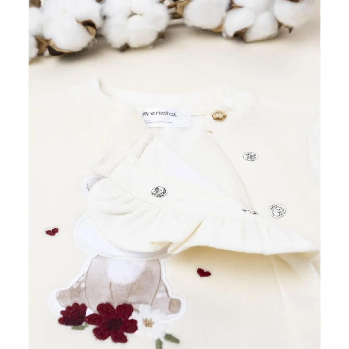 Este pelele con pies en tono crema viste a la bebé con dulzura y confort. La prenda, de terciopelo de algodón, luce una tierna ciervita estampada y una práctica apertura frontal en diagonal con automáticos adornados con pequeñas flores, además de corchetes en la entrepierna para agilizar el cambio de pañal. Las babuchas integradas mantienen el pie calentito evitando calcetines sueltos.