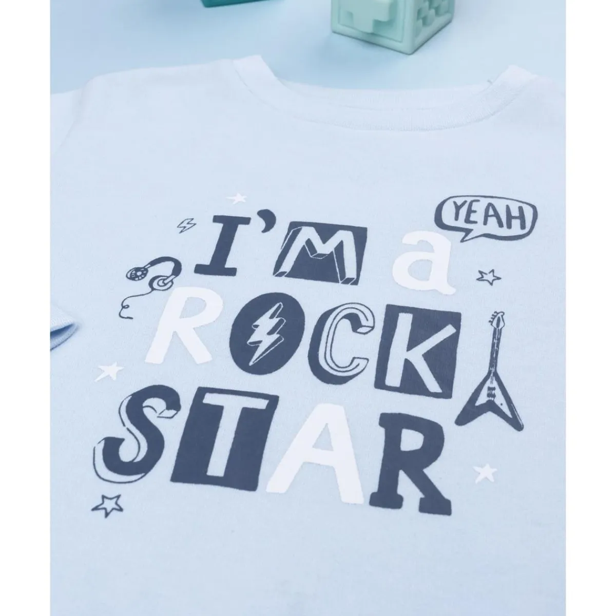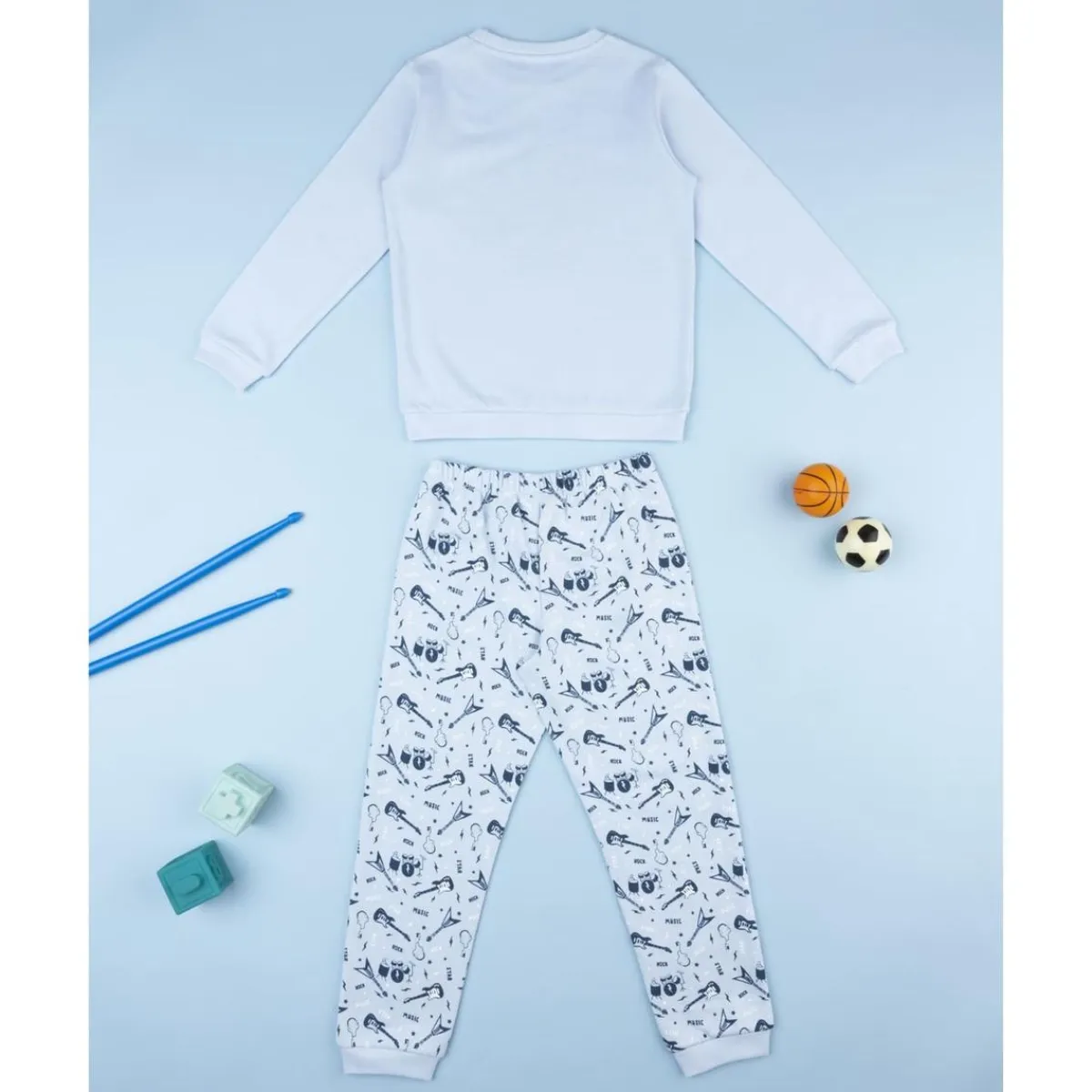 El pijama de dos piezas para niño combina comodidad y estilo. La camiseta de manga larga en azul claro presenta una estampación divertida con temática musical, mientras que el pantalón a juego, también en azul, incorpora cintura elástica para un ajuste cómodo y seguro.