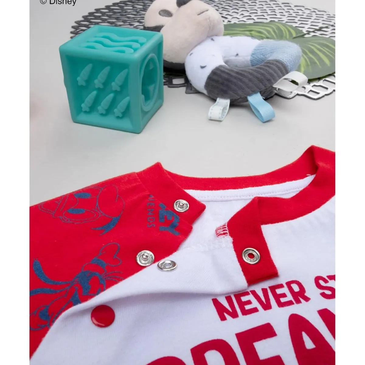 Pijama de dos piezas en tonos blanco y rojo, con estampado de Mickey Mouse. Incluye botones automáticos en el hombro y cintura elástica en el pantalón. Fabricado en algodón Oeko-Tex, seguro y cómodo.