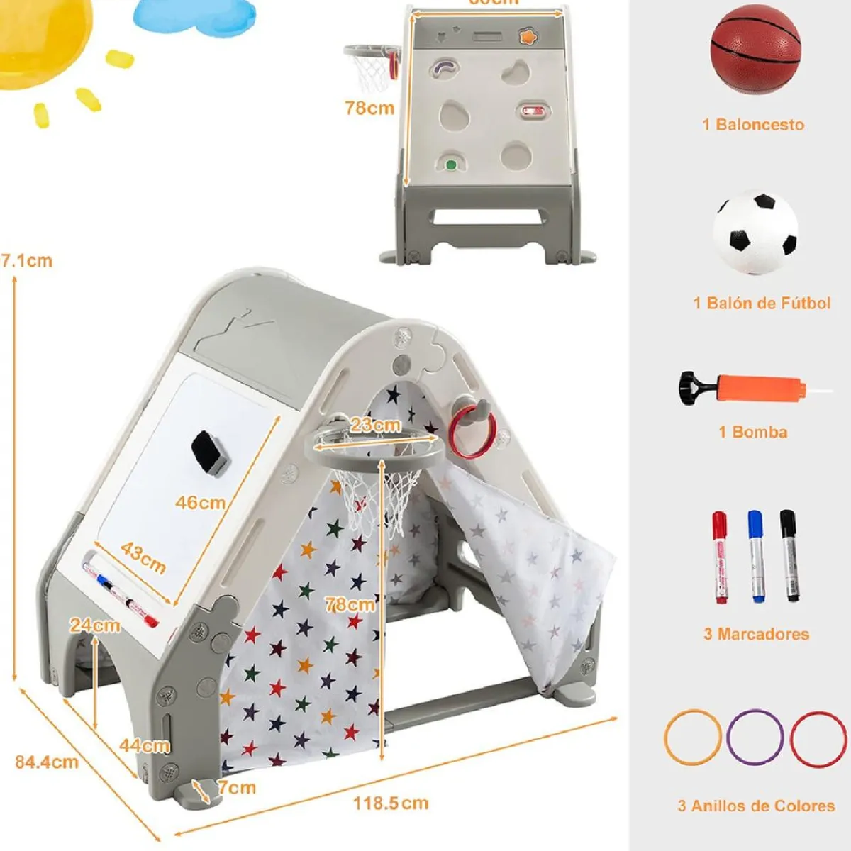 Tienda de campaña con actividades, una tienda muy divertida para que tu pequeño aventurero disfrute de horas de entretenimiento.