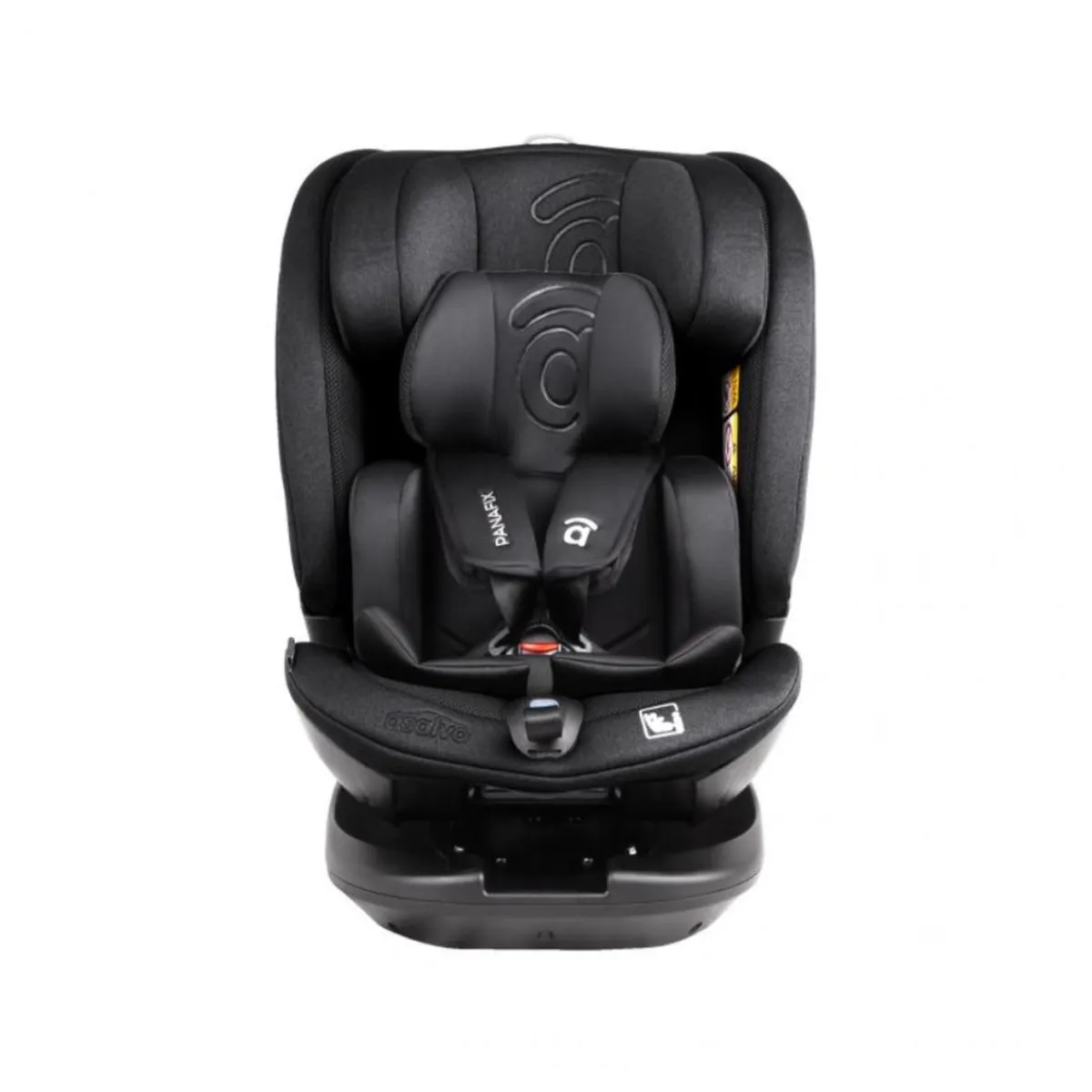 Asalvo – Silla de auto Panafix Negra 40-150 cm. Para niños de 40 a 150 cm de estatura. Ofrece una instalación segura con el sistema Isofix y top tether, brindando tranquilidad a los padres. Este asiento giratorio 360º permite una versatilidad excepcional, y su capacidad de orientación contramarcha hasta los 105 cm (18 kg) garantiza una seguridad óptima.