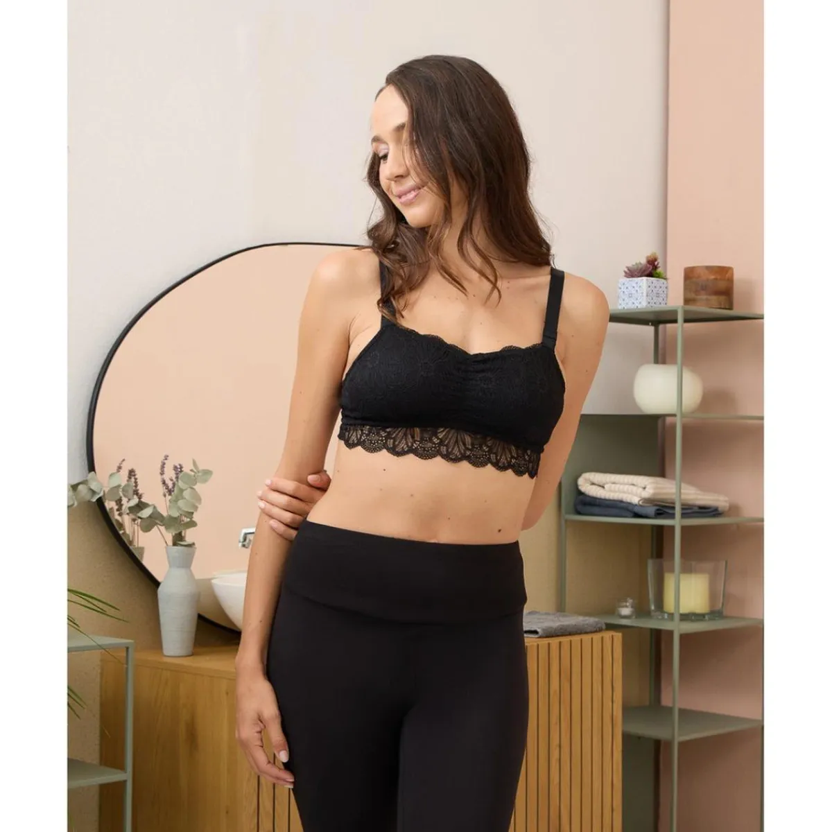 Cómodo sujetador de lactancia en romántico encaje negro con motivo floral. Copas desmontables que facilitan el momento de la lactancia y tirantes ajustables. También se puede usar como crop top.