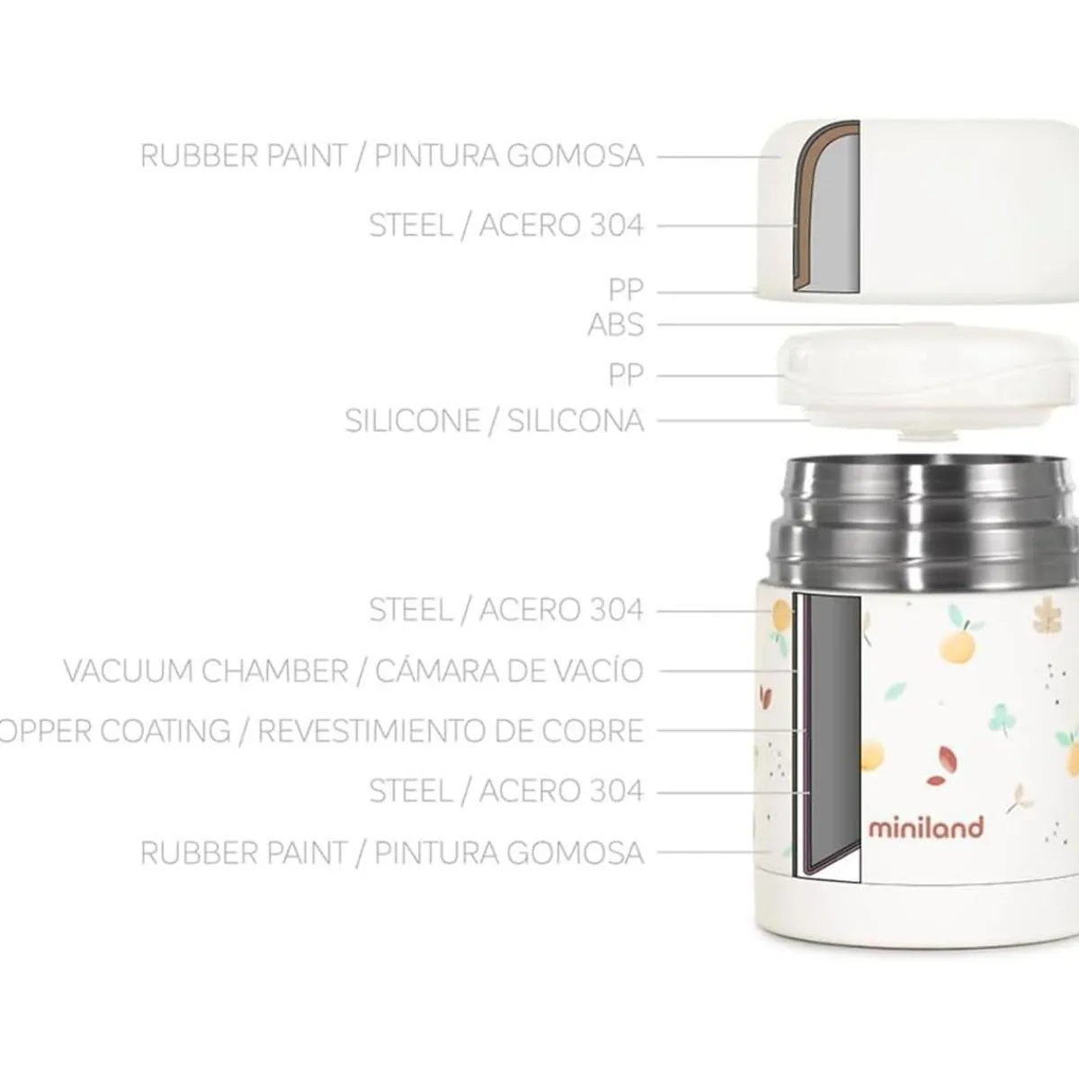 Este práctico recipiente térmico tiene una generosa capacidad de 600 ml, ideal para las raciones de tu bebé. Su revestimiento exterior de goma le da un tacto suave y un agarre seguro, con un diseño divertido y original en colores dulces. La doble pared de acero, junto con un exclusivo revestimiento de cobre y una capa interior de acero 18/8 (acero inoxidable 304), asegura una muy baja conductividad térmica y una buena resistencia a las altas temperaturas, manteniendo la temperatura de los alimentos por más tiempo.