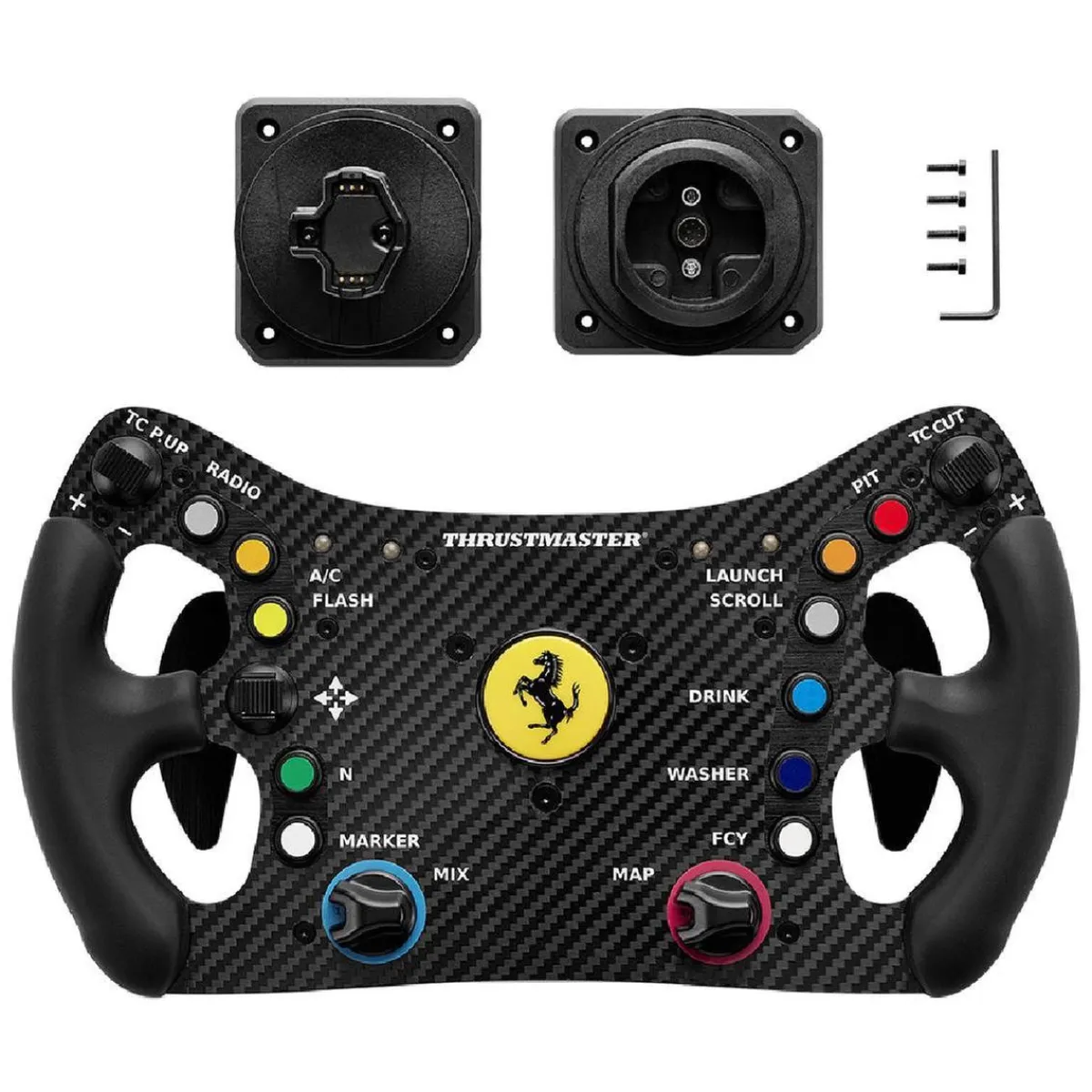 El Ferrari 488 GT3 Wheel Add-On es compatible de forma nativa con todas las bases de volante de carreras de Thrustmaster, gracias a los dos soportes de Quick Release que permiten a los usuarios seleccionar el accesorio compatible con su base de volante de carreras sin necesidad de un adaptador adicional. Este sistema de fijación de siguiente generación garantiza una transmisión directa entre la base de volante de carreras y el aro de volante.