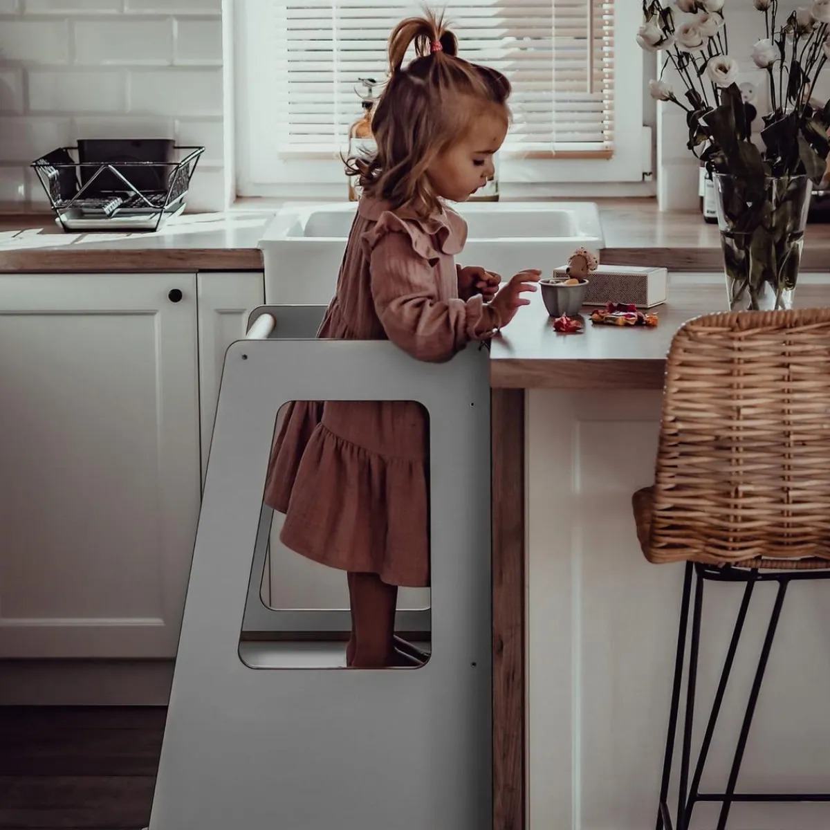 Presentamos el Kitchen Helper de madera, en acabado blanco. Esta estructura está pensada para que los más pequeños acompañen al adulto en la cocina de forma segura y participativa.