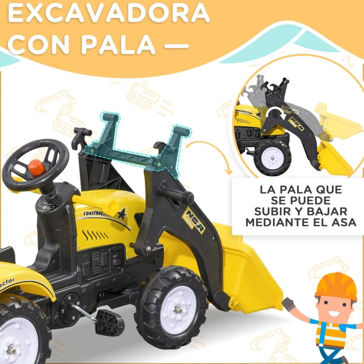 Además, viene con una pala excavadora, el remolque se puede desmontar y viene con 2 accesorios para jugar en la arena. El volante gira hacia la izquierda y hacia la derecha y se puede pedalear de un lado a otro, de modo que tu hijo hará ejercicio mientras juega.