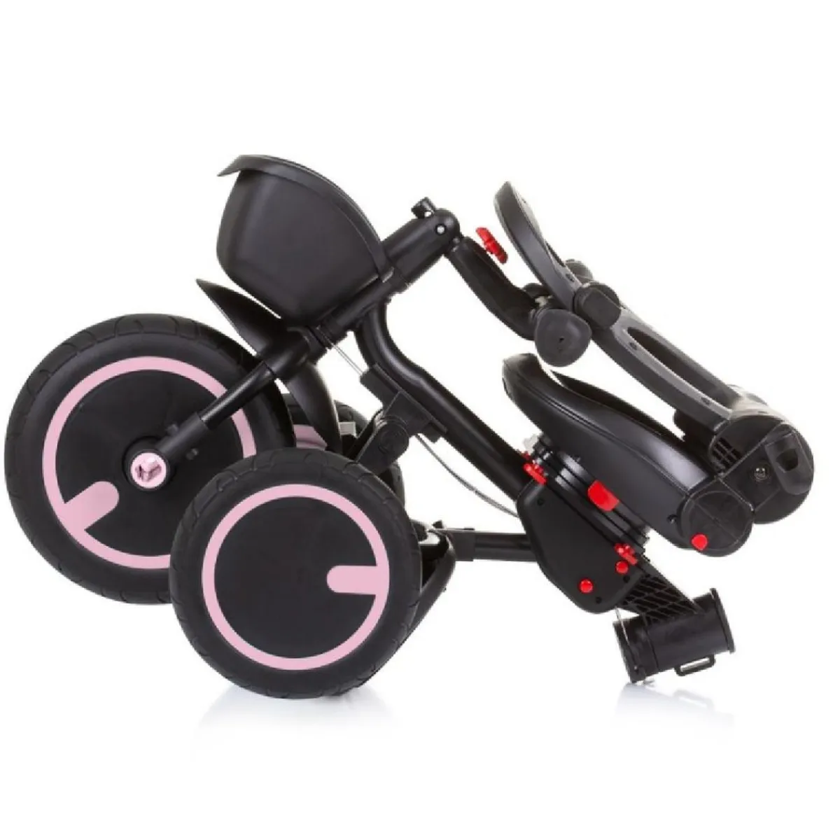 Triciclo Plegable Rosa, es un triciclo que puede ser conducido por el niño o empujado por un adulto usando el mango.