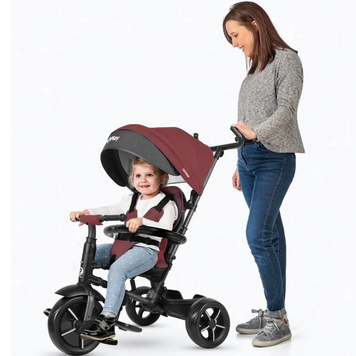 Un triciclo con el que podrás manejar la dirección y la velocidad con el manillar telescópico y también activar el freno en la parte trasera para dejarlo fijo en un lugar.