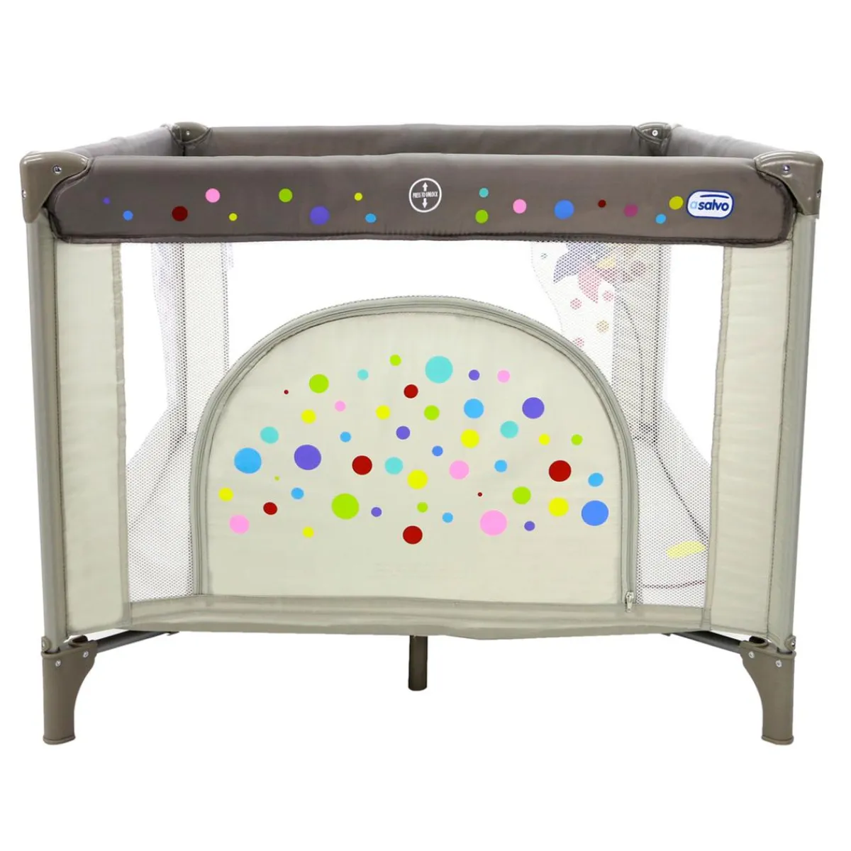 Asalvo – Parque Cuadrado Molinillo, un parque de diseño sólido, con 2 ruedas con freno y decoración en los 4 lados para que el niño lo utilice desde los primeros meses.