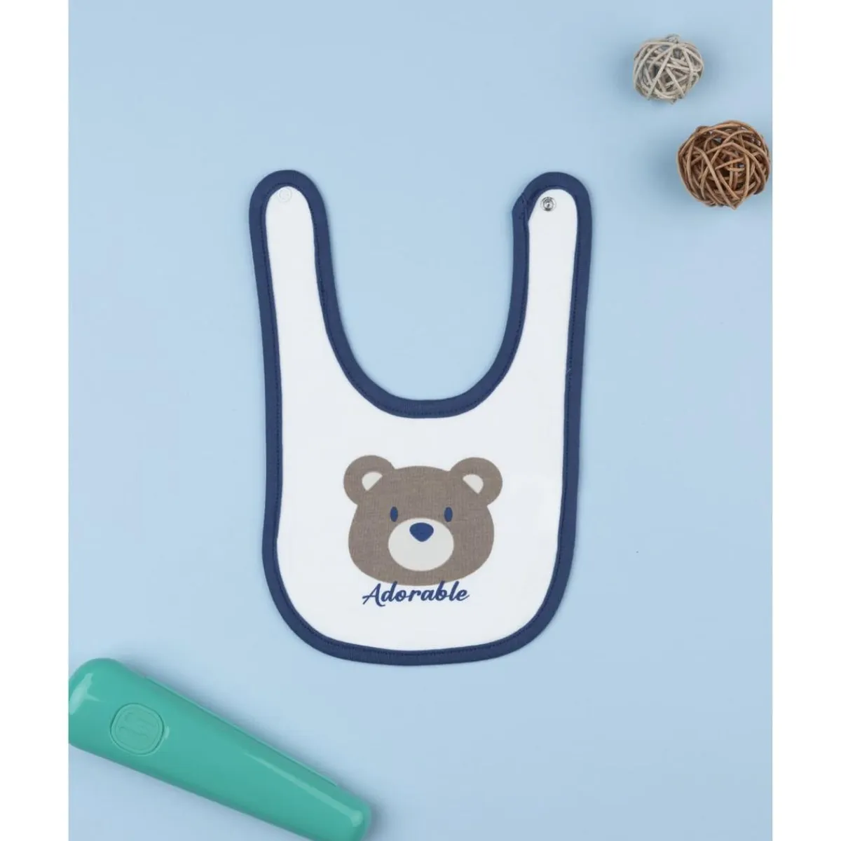 Este babero infantil está confeccionado en algodón suave, perfecto para proteger la ropa durante las comidas. Presenta base blanca con ribete azul y un delicado estampado de osito en la parte frontal. Incluye cierre con botón automático en el cuello para un ajuste cómodo y seguro.