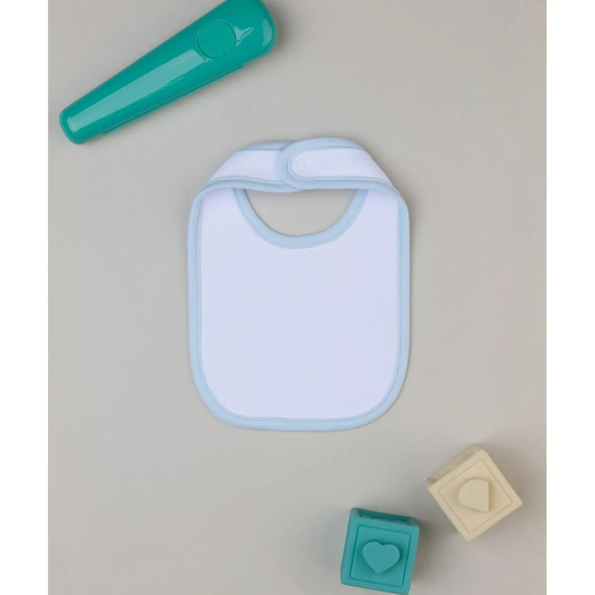 Babero casual para niño con base blanca y estampado azul claro. Ajuste seguro con botón automático. Solo el babero.