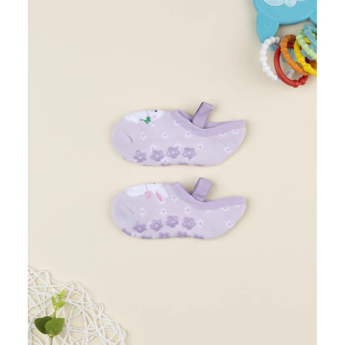 Bailarinas casual de punto para niña en lila con estampado coordinado de conejitos. La sujeción elástica y los gommini en forma de estrella garantizan comodidad y estabilidad al caminar.