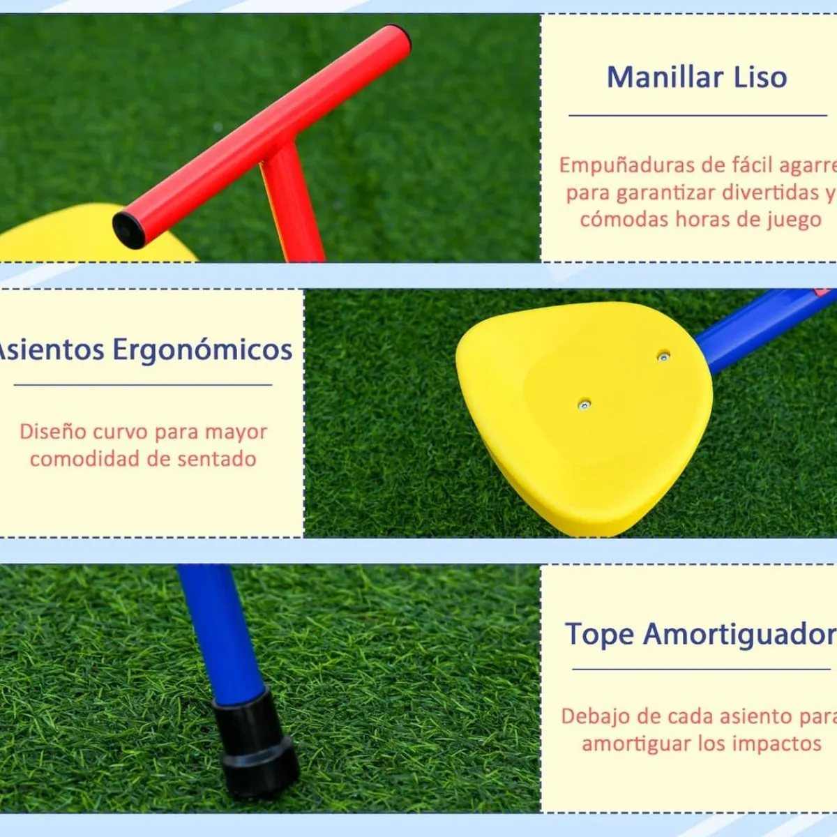 Además de la función de balancín tradicional, puedes añadir diversión girando 360 grados. ¡El balancín puede girar mientras sube y baja como si fuera un tiovivo! Debajo de cada asiento hay un tope para amortiguar los impactos.