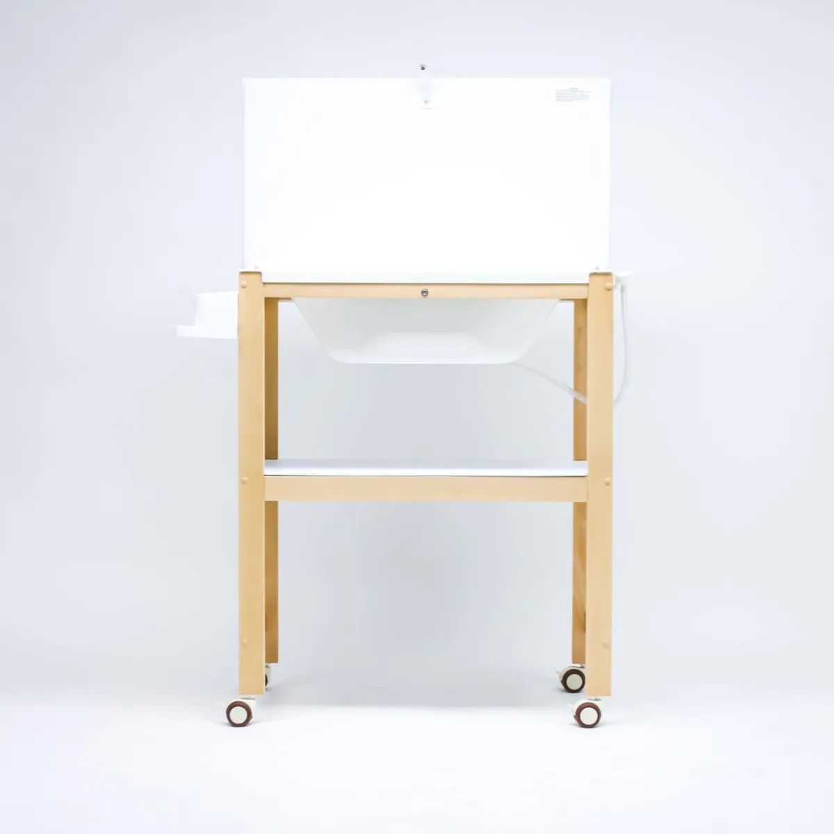 Tiene la cubeta rigida y, además, dispone de una estanteria de madera forrada de PVC muy práctica, para que puedas almacenar todo lo que necesita el bebé en el momento del baño. Cuenta también con manguera desagüe y cestas de plastico.