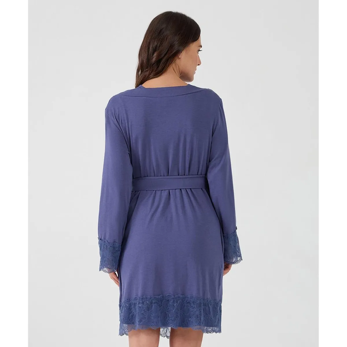Bata premamá de lactancia azul con detalles de encaje tono sobre tono. La suave faja se puede atar debajo del pecho durante el dulce embarazo o también en la cintura después del embarazo.