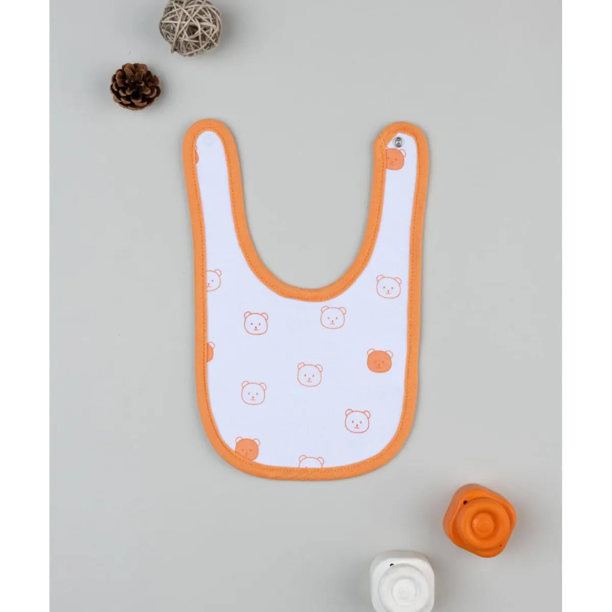Tierno babero para recién nacido. Se presenta sobre base blanca con un estampado allover de ositos. Borde en color naranja liso a contraste. Cierre con botón a presión en el cuello. Accesorios no incluidos. La caja contiene solo la prenda de ropa.