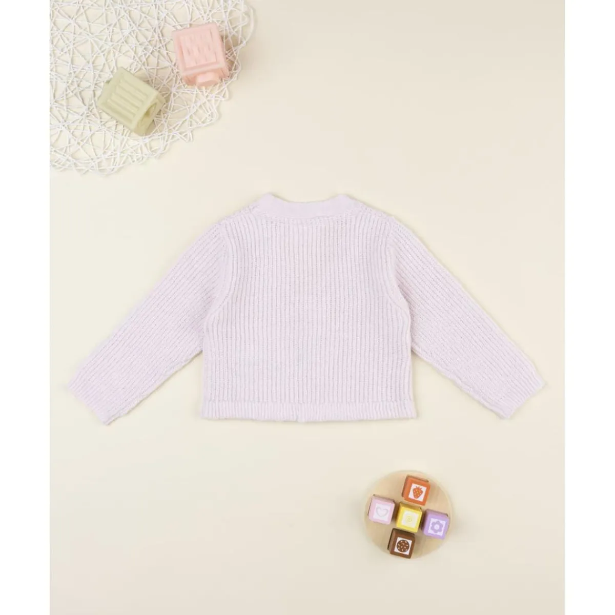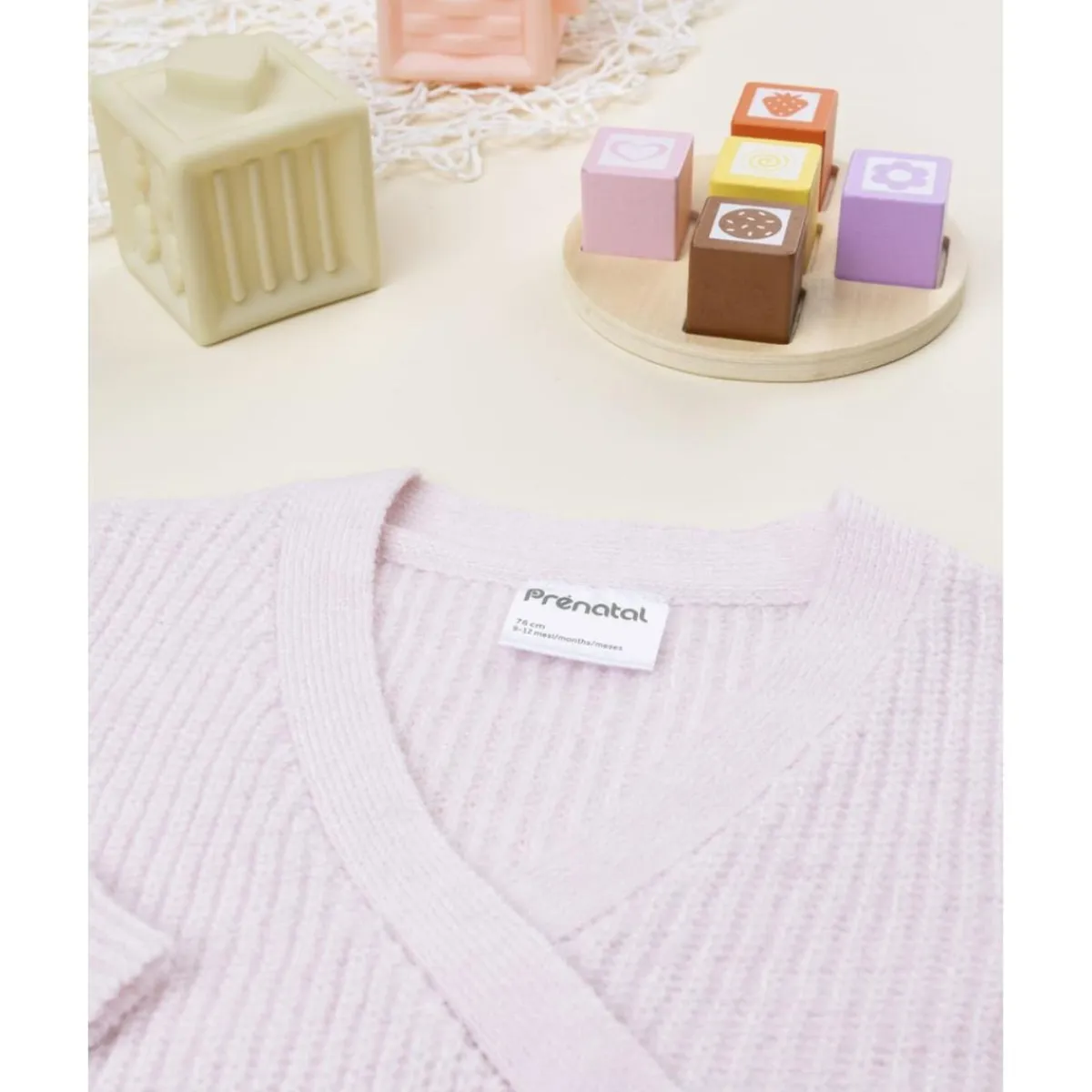 Dulce cárdigan tricot para niña en tono rosa claro, con corte cruzado y lazo decorativo en el mismo color. Su textura suave y su diseño versátil lo convierten en una prenda ideal para cualquier ocasión casual.