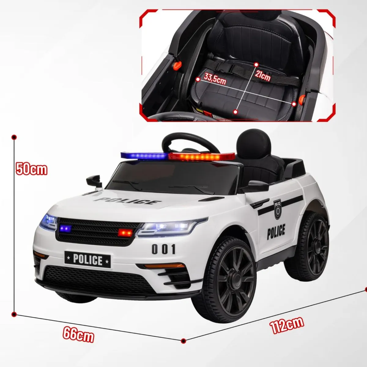 Homcom – Coche de policía eléctrico Blanco, con mando a distancia incluye dos motores de 12V y permite elegir entre tres velocidades ajustables de 3 a 5 km/h, ideal para que los más pequeños disfruten de la emoción de conducir con seguridad.
