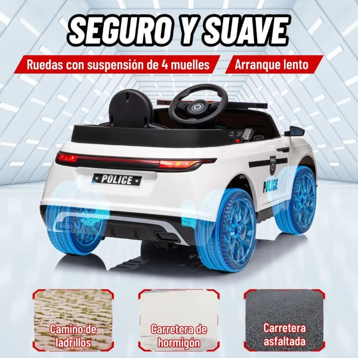- Coche eléctrico infantil que simula un auto de policía.