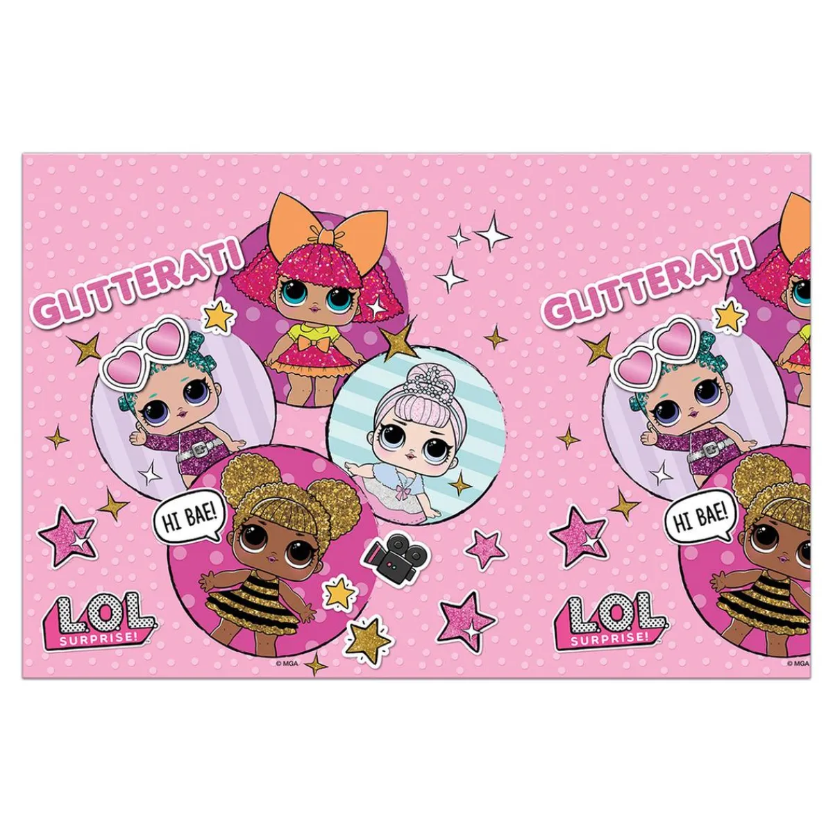Tiene decoraciones de LOL Surprise sobre un fondo rosa y estrellas.