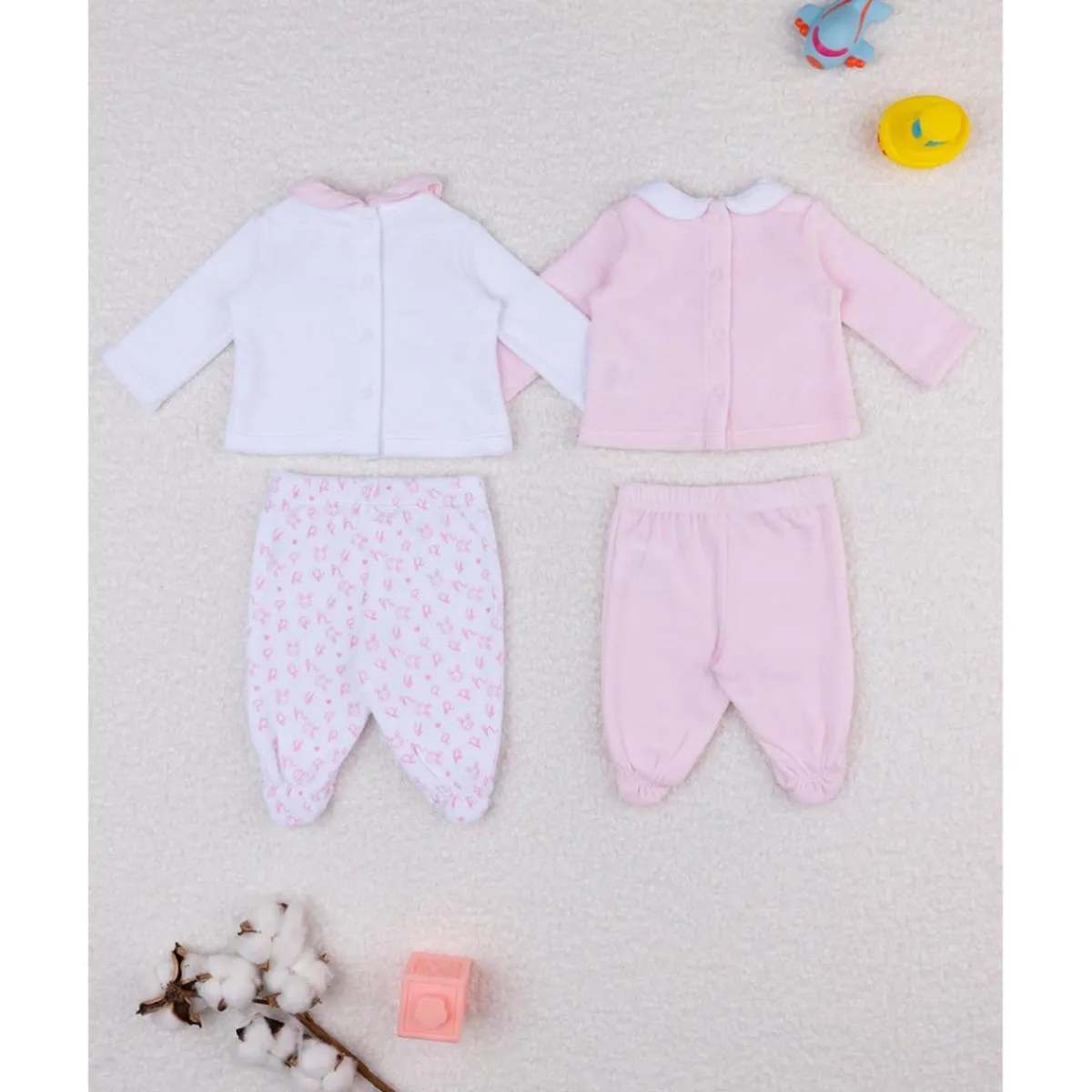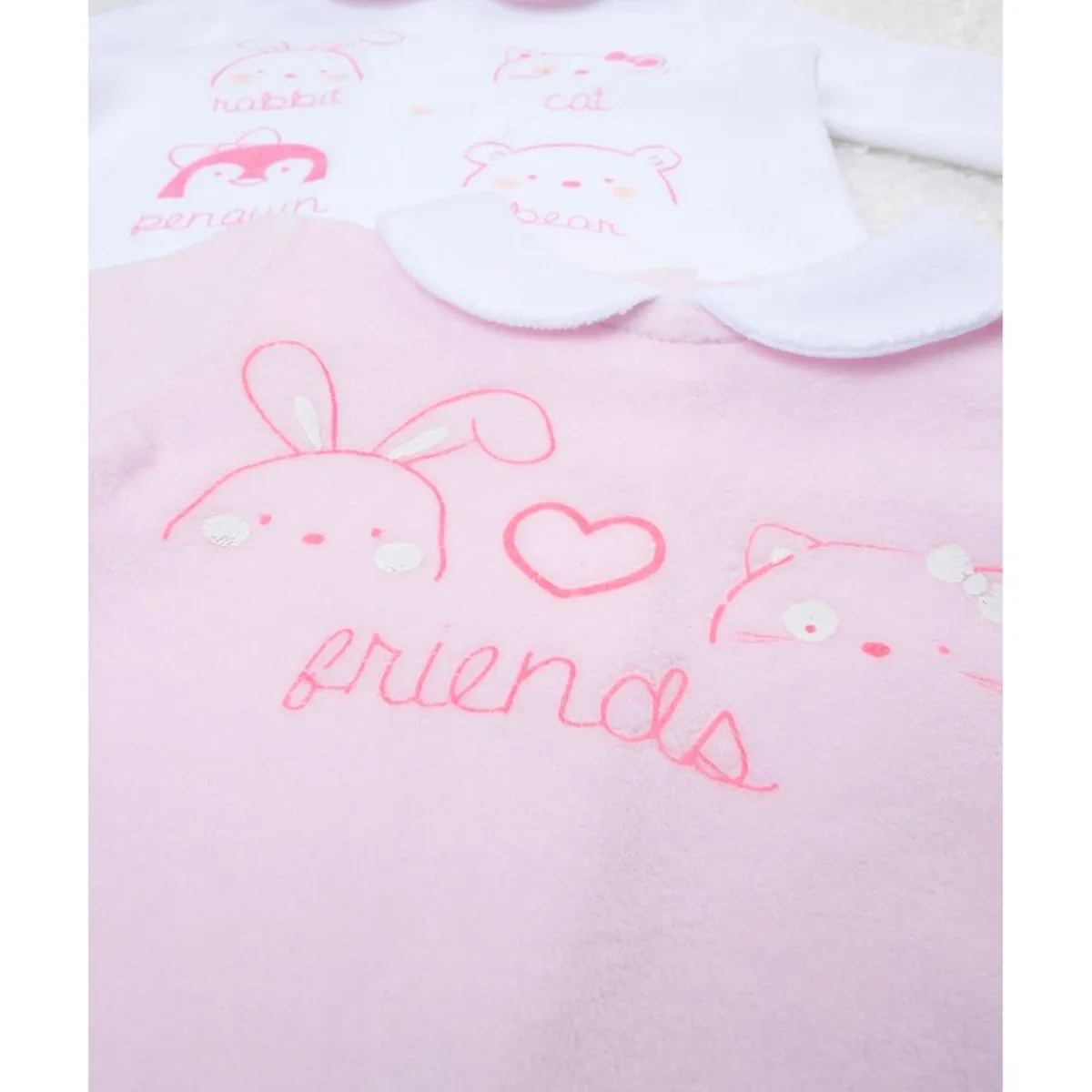 Pack compuesto por dos conjuntos de terciopelo con camiseta y polainas. Una camiseta es color crema con un osito, un gatito, un conejito y un pingüino estampados en la parte delantera, con automáticos en la parte trasera y mangas largas; polainas rosadas a juego. La otra camiseta es rosa con un gatito y un conejito en el frente; polainas color crema a juego con estampado de pequeños dibujos rosas por toda la parte. Accesorios no a la venta. El paquete contiene solo la prenda de vestir.