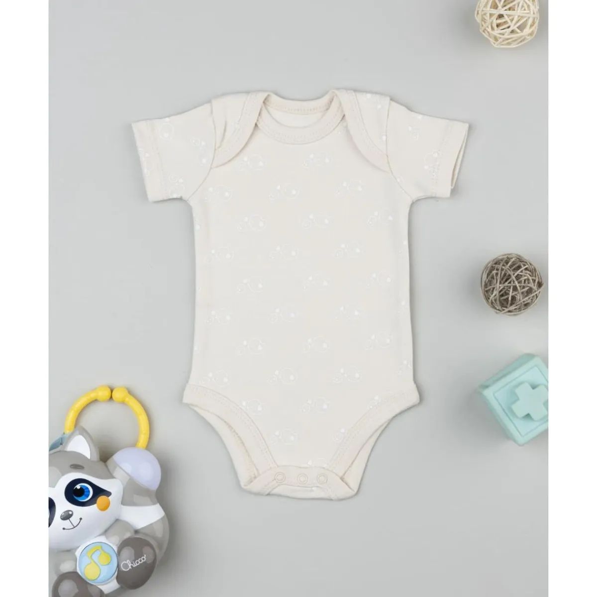 Este body de bebé de manga corta está confeccionado en algodón felpado certificado OEKO-TEX, pensado para la seguridad y el confort de la piel sensible. Se presenta en tono beige con estampado allover de pequeñas flores. Incorpora cuello tipo americano y botones automáticos en la entrepierna para un ajuste fácil.